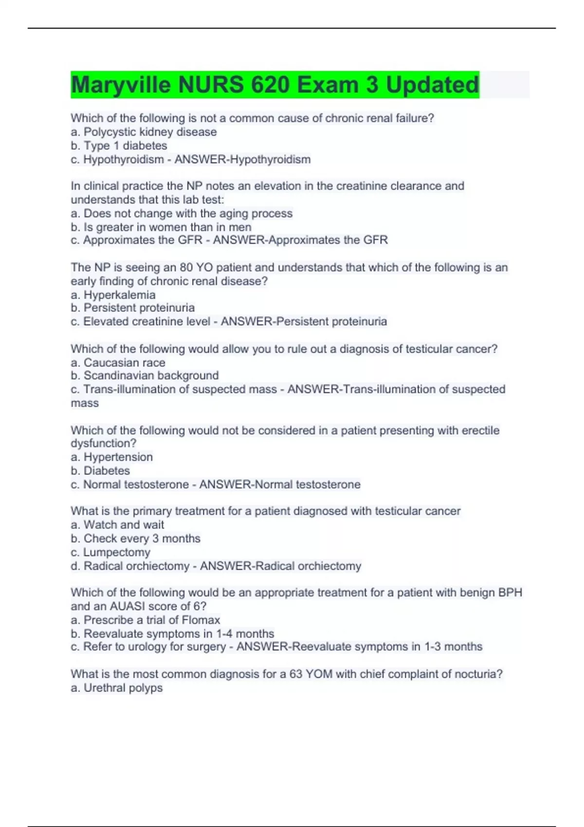 Which of the following is not a common cause of chronic renal failure? a. Polycystic kidney disease b. Type 1 diabetes c. Hypothyroidism - ANSWER-Hypothyroidism In clinical practice the NP notes an elevation in the creatinine clearance and understands that this lab test: a. Does not change with the aging process b. Is greater in women than in men c. Approximates the GFR - ANSWER-Approximates the GFR The NP is seeing an 80 YO patient and understands that which of the following is an early finding of chronic renal disease? a. Hyperkalemia b. Persistent proteinuria c. Elevated creatinine level - ANSWER-Persistent proteinuria Which of the following would allow you to rule out a diagnosis of testicular cancer? a. Caucasian race b. Scandinavian background c. Trans-illumination of suspected mass - ANSWER-Trans-illumination of suspected mass Which of the following would not be considered in a patient presenting with erectile dysfunction? a. Hypertension b. Diabetes c. Normal testosterone - ANSWER-Normal testosterone What is the primary treatment for a patient diagnosed with testicular cancer a. Watch and wait b. Check every 3 months c. Lumpectomy d. Radical orchiectomy - ANSWER-Radical orchiectomy Which of the following would be an appropriate treatment for a patient with benign BPH and an AUASI score of 6? a. Prescribe a trial of Flomax b. Reevaluate symptoms in 1-4 months c. Refer to urology for surgery - ANSWER-Reevaluate symptoms in 1-3 months What is the most common diagnosis for a 63 YOM with chief complaint of nocturia? a. Urethral polyps