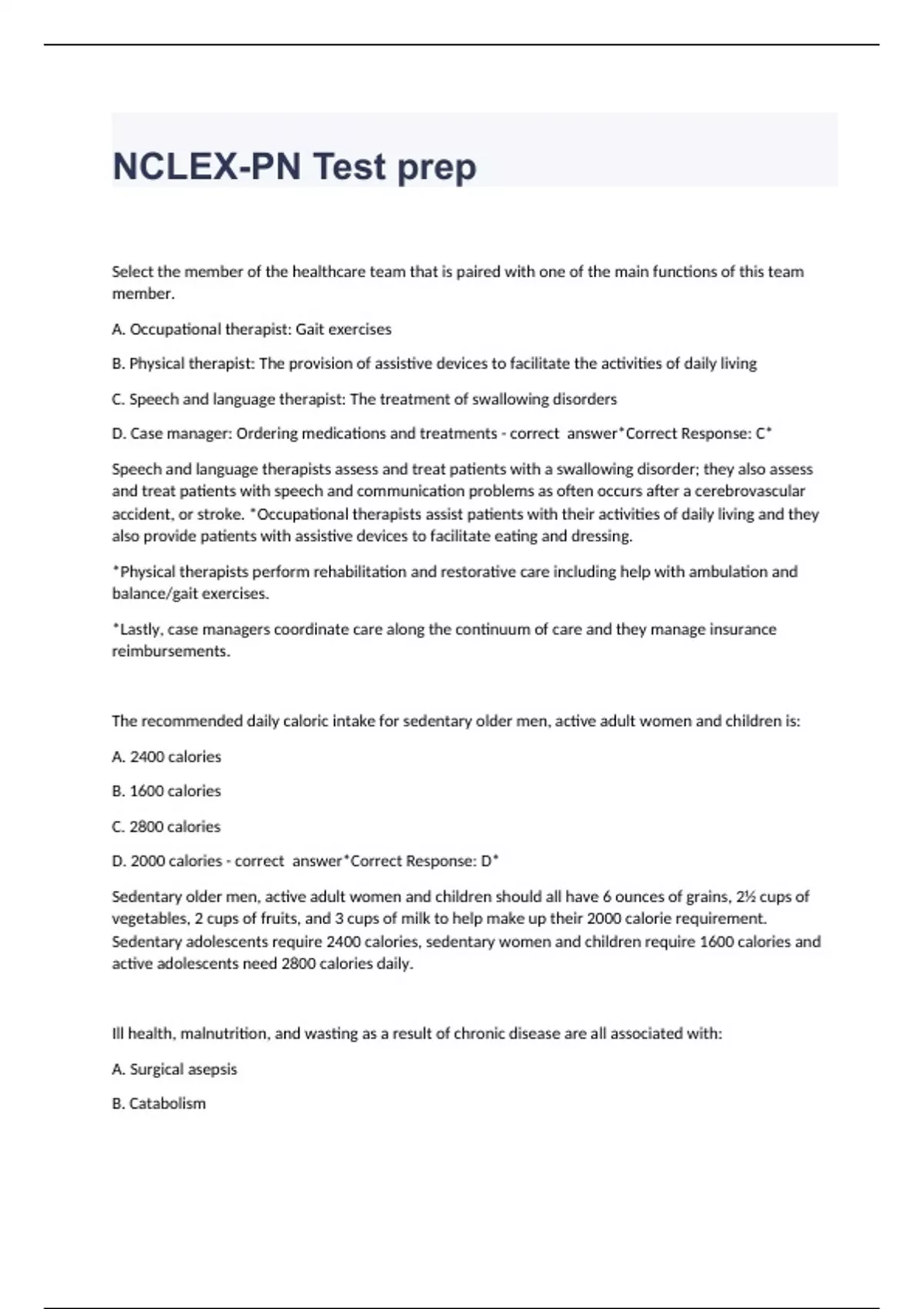 Select the member of the healthcare team that is paired with one of the main functions of this team member. A. Occupational therapist: Gait exercises B. Physical therapist: The provision of assistive devices to facilitate the activities of daily living C. Speech and language therapist: The treatment of swallowing disorders D. Case manager: Ordering medications and treatments - correct answer*Correct Response: C* Speech and language therapists assess and treat patients with a swallowing disorder; they also assess and treat patients with speech and communication problems as often occurs after a cerebrovascular accident, or stroke. *Occupational therapists assist patients with their activities of daily living and they also provide patients with assistive devices to facilitate eating and dressing. *Physical therapists perform rehabilitation and restorative care including help with ambulation and balance/gait exercises. *Lastly, case managers coordinate care along the continuum of care and they manage insurance reimbursements. The recommended daily caloric intake for sedentary older men, active adult women and children is: A. 2400 calories B. 1600 calories C. 2800 calories D. 2000 calories - correct answer*Correct Response: D* Sedentary older men, active adult women and children should all have 6 ounces of grains, 2½ cups of vegetables, 2 cups of fruits, and 3 cups of milk to help make up their 2000 calorie requirement. Sedentary adolescents require 2400 calories, sedentary women and children require 1600 calories and active adolescents need 2800 calories daily. Ill health, malnutrition, and wasting as a result of chronic disease are all associated with: A. Surgical asepsis B. Catabolism C. Cachexia D. Venous stasis - correct answer*Correct Response: C* Ill health, malnutrition, and wasting as a result of chronic disease are all associated with cachexia. Cachexia can also result from dehiscence of a surgical incision or rupture of wound closure. *Surgical asepsis refers to using a sterile technique to protect against infection before, during, and after surgery. The breakdown of tissue, especially after severe trauma or crush injuries is known as *catabolism. *Venous stasis is a disorder related to pooling of blood in a vein of the body; venous stasis typically occurs in the lower extremities and it is one of the many hazards, or complications, of immobilization. Select all the possible opportunistic infections that adversely affect HIV/AIDS infected patients: A. Visual losses B. Kaposi's sarcoma C. Wilms' sarcoma