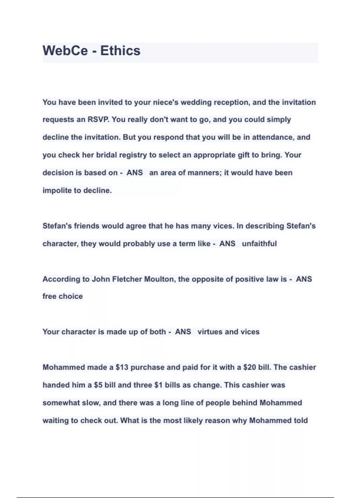 WebCe - Ethics QUESTIONS & ANSWERS 2023 ( A+ GRADED 100% VERIFIED)