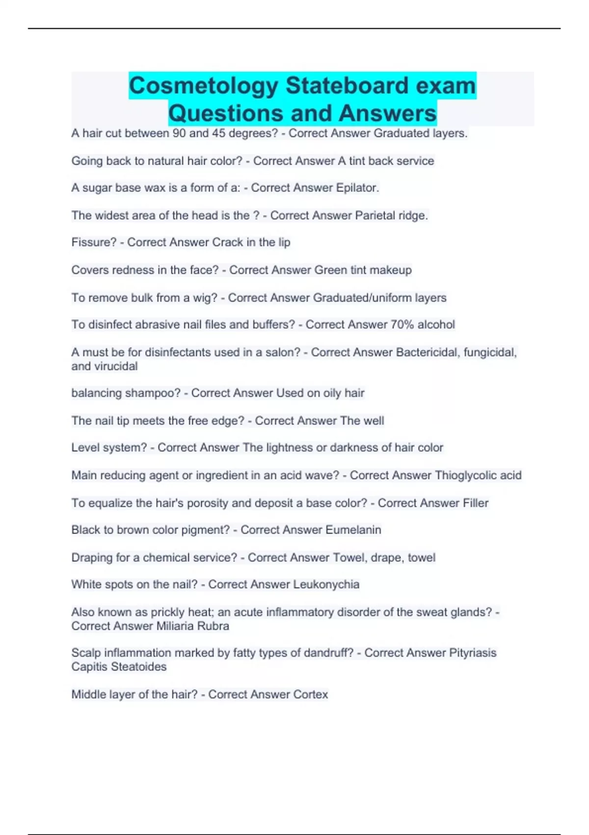A hair cut between 90 and 45 degrees? - Correct Answer Graduated layers. Going back to natural hair color? - Correct Answer A tint back service A sugar base wax is a form of a: - Correct Answer Epilator. The widest area of the head is the ? - Correct Answer Parietal ridge. Fissure? - Correct Answer Crack in the lip Covers redness in the face? - Correct Answer Green tint makeup To remove bulk from a wig? - Correct Answer Graduated/uniform layers To disinfect abrasive nail files and buffers? - Correct Answer 70% alcohol A must be for disinfectants used in a salon? - Correct Answer Bactericidal, fungicidal, and virucidal balancing shampoo? - Correct Answer Used on oily hair The nail tip meets the free edge? - Correct Answer The well Level system? - Correct Answer The lightness or darkness of hair color Main reducing agent or ingredient in an acid wave? - Correct Answer Thioglycolic acid To equalize the hair's porosity and deposit a base color? - Correct Answer Filler Black to brown color pigment? - Correct Answer Eumelanin Draping for a chemical service? - Correct Answer Towel, drape, towel White spots on the nail? - Correct Answer Leukonychia Also known as prickly heat; an acute inflammatory disorder of the sweat glands? - Correct Answer Miliaria Rubra Scalp inflammation marked by fatty types of dandruff? - Correct Answer Pityriasis Capitis Steatoides Middle layer of the hair? - Correct Answer Cortex
