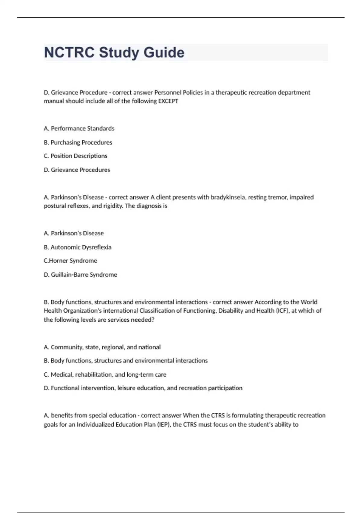 NCTRC Study GuideD. Grievance Procedure Personnel Policies in a therapeutic recreation department manual should include all of the following EXCEPT A. Performance Standards B. Purchasing Procedures C. Position Descriptions D. Grievance Procedures A. Parkinson's Disease A client presents with bradykinseia, resting tremor, impaired postural reflexes, and rigidity. The diagnosis is A. Parkinson's Disease B. Autonomic Dysreflexia C.Horner Syndrome D. Guillain-Barre Syndrome B. Body functions, structures and environmental interactions According to the World Health Organization's international Classification of Functioning, Disability and Health (ICF), at which of the following levels are services needed? A. Community, state, regional, and national B. Body functions, structures and environmental interactions C. Medical, rehabilitation, and long-term care D. Functional intervention, leisure education, and recreation participation A. benefits from special education When the CTRS is formulating therapeutic recreation goals for an Individualized Education Plan (IEP), the CTRS must focus on the student's ability to A. benefits from special education B. engage in inclusive recreation C. join after school programs D. remain in the classroom with peers A. Extrapyramidal movement Early signs including an unusual gait, tremors, and motor restlessness indicate which of the following side effects of antipsychotic medications? A. Extrapyramidal movement B. Acute psychosis C. Tardive dyskinesia D. Autonomic dysreflexia D. Minimum Data Set (MDS) In a nursing home setting, which of the following interdisciplinary tools would a CTRS be responsible for completing? A. Inpatient Rehabiliation Facility-Patient Assessment Instrument (IRF-PAI) B.Functional Independence Measure (FIM) C. Leisure Attitude Measurement (LAM) D. Minimum Data Set (MDS)