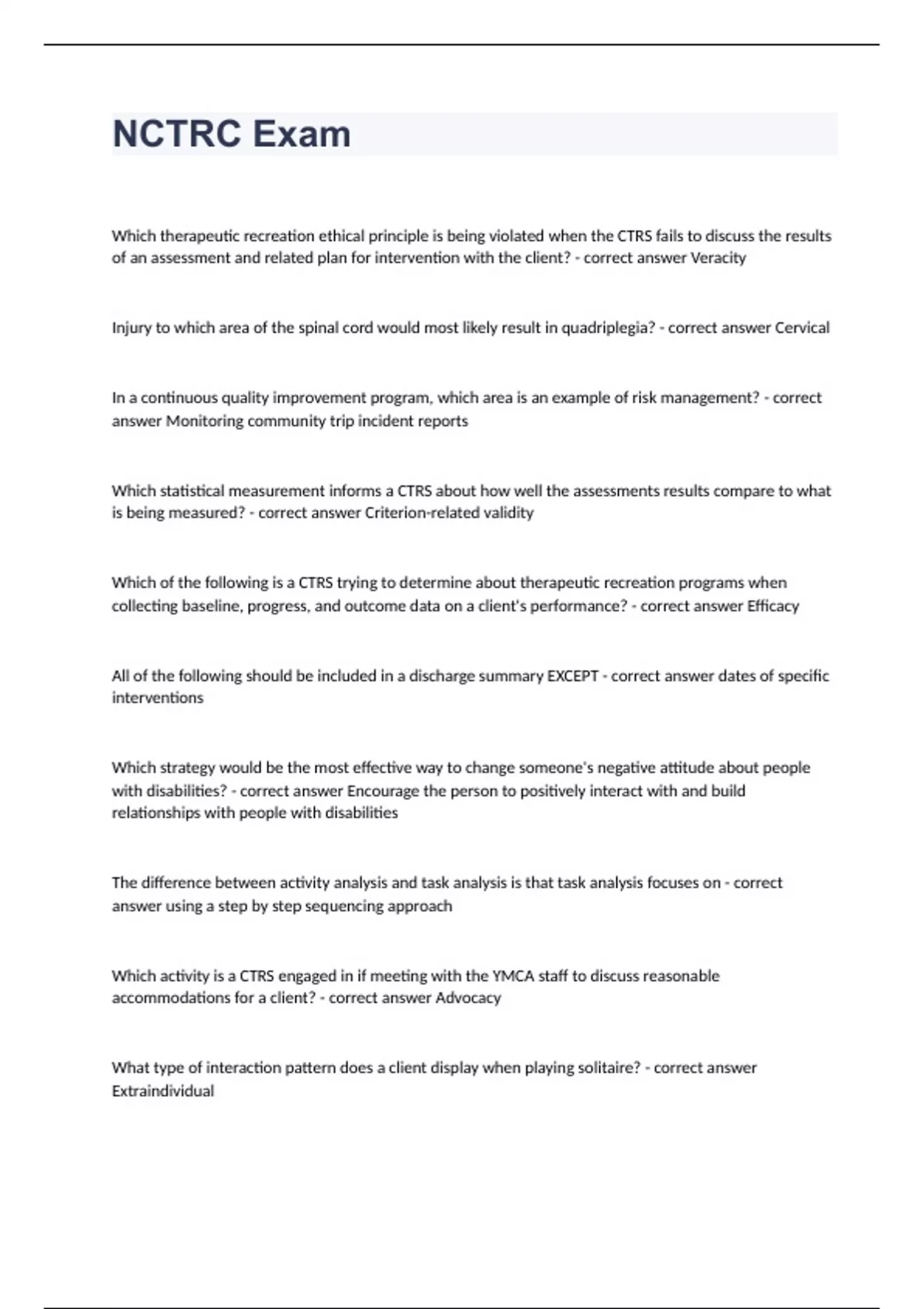 NCTRC ExamWhich therapeutic recreation ethical principle is being violated when the CTRS fails to discuss the results of an assessment and related plan for intervention with the client? Veracity Injury to which area of the spinal cord would most likely result in quadriplegia? Cervical In a continuous quality improvement program, which area is an example of risk management? Monitoring community trip incident reports Which statistical measurement informs a CTRS about how well the assessments results compare to what is being measured? Criterion-related validity Which of the following is a CTRS trying to determine about therapeutic recreation programs when collecting baseline, progress, and outcome data on a client's performance? Efficacy All of the following should be included in a discharge summary EXCEPT dates of specific interventions Which strategy would be the most effective way to change someone's negative attitude about people with disabilities? Encourage the person to positively interact with and build relationships with people with disabilities The difference between activity analysis and task analysis is that task analysis focuses on using a step by step sequencing approach Which activity is a CTRS engaged in if meeting with the YMCA staff to discuss reasonable accommodations for a client? Advocacy What type of interaction pattern does a client display when playing solitaire? Extraindividual