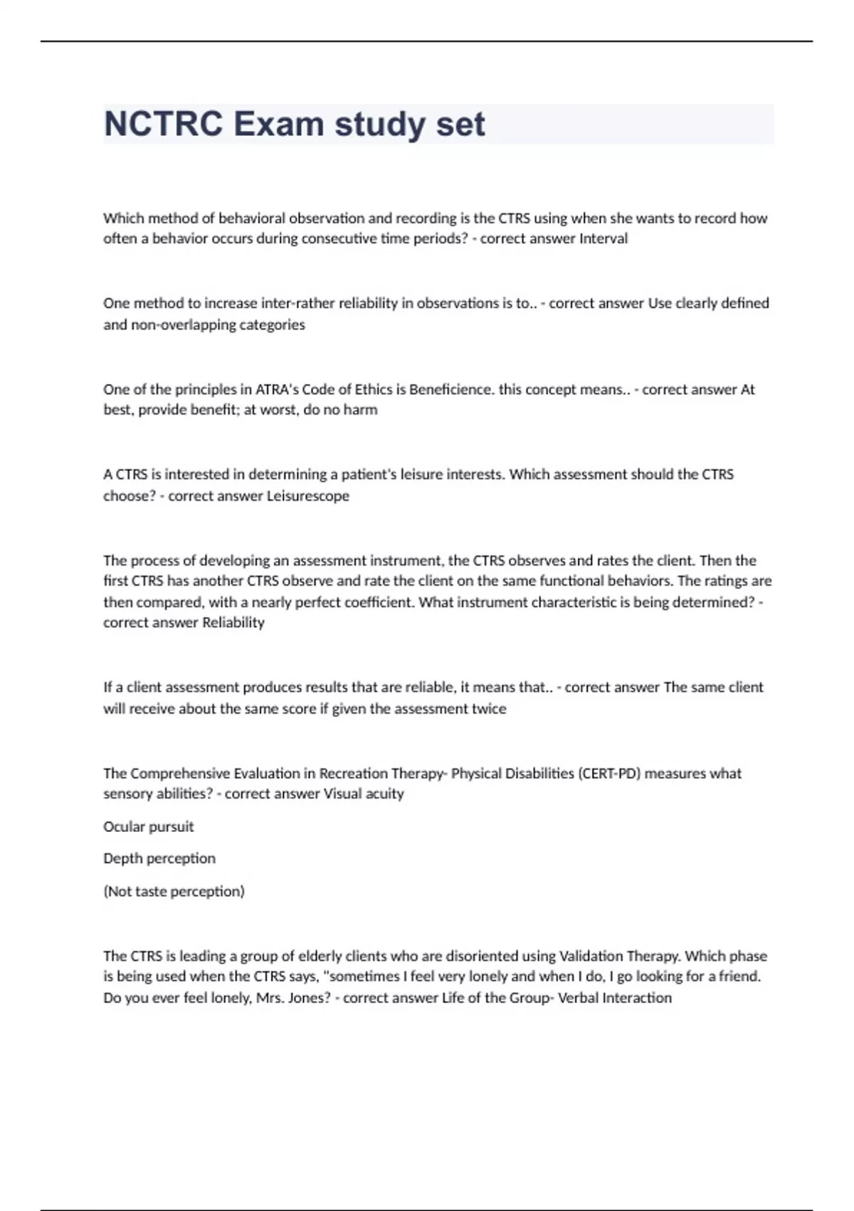 NCTRC Exam study setWhich method of behavioral observation and recording is the CTRS using when she wants to record how often a behavior occurs during consecutive time periods? Interval One method to increase inter-rather reliability in observations is to.. Use clearly defined and non-overlapping categories One of the principles in ATRA's Code of Ethics is Beneficience. this concept means.. At best, provide benefit; at worst, do no harm A CTRS is interested in determining a patient's leisure interests. Which assessment should the CTRS choose? Leisurescope The process of developing an assessment instrument, the CTRS observes and rates the client. Then the first CTRS has another CTRS observe and rate the client on the same functional behaviors. The ratings are then compared, with a nearly perfect coefficient. What instrument characteristic is being determined? Reliability If a client assessment produces results that are reliable, it means that.. The same client will receive about the same score if given the assessment twice The Comprehensive Evaluation in Recreation Therapy- Physical Disabilities (CERT-PD) measures what sensory abilities? Visual acuity Ocular pursuit Depth perception (Not taste perception) The CTRS is leading a group of elderly clients who are disoriented using Validation Therapy. Which phase is being used when the CTRS says, "sometimes I feel very lonely and when I do, I go looking for a friend. Do you ever feel lonely, Mrs. Jones? Life of the Group- Verbal Interaction The term "continuity of care" means that the.. Treatment team strives to provide predictable, connected, meaningful programs to clients The CTRS wants the client to gain upper body strength so he can propel his wheelchair for longer distances. The CTRS would most likely use Weight training The Functional Assessment of Characteristics for TR- Revised (FACTR-R) measures what? Prerequisite skills related to leisure participation The CTRS designed a program to assist older adults with intellectual disabilities to share their previous life experiences after reading poetry about children. The CTRS was using a technique known as... Remotivation In order to benefit from aerobic exercise, individuals need to reach and stay within their target heart rate for at least twenty minutes. This formula for calculating target heart rate is: 60 to 70% of normal maximum heart rate The CTRS employs an activity that focuses on the client's thoughts. What is the kind of therapy called? Cognitive therapy The CTRS is leading a group of elderly clients who are disoriented using Validation Therapy. Which phase is being used when the CTRS says, "Mr. Smith did you remember to bring the poem you wanted to share with us? You did. Great! O.K., let's listen to Mr. Smith's poem," Birth of the group- Creating Energy When a CTRS provides an accepting and understanding attitude to a client and, as a result, that positive involvement reduces the client's feelings of loneliness and worthlessness, and helps the client to take responsibility to alter irresponsible behavior, the CTRS is probably using what therapy? Rational emotive Which of the following activity titles seem most appropriate to help clients develop social skills? Bingo Interaction skills for adults Low-cost activities for children Volleyball Interaction skills for adults
