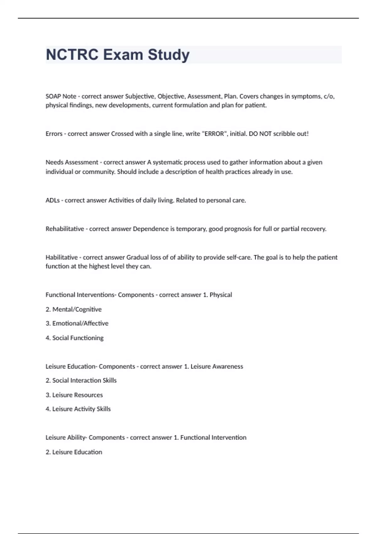 NCTRC Exam StudySOAP Note Subjective, Objective, Assessment, Plan. Covers changes in symptoms, c/o, physical findings, new developments, current formulation and plan for patient. Errors Crossed with a single line, write "ERROR", initial. DO NOT scribble out! Needs Assessment A systematic process used to gather information about a given individual or community. Should include a description of health practices already in use. ADLs Activities of daily living. Related to personal care. Rehabilitative Dependence is temporary, good prognosis for full or partial recovery. Habilitative Gradual loss of of ability to provide self-care. The goal is to help the patient function at the highest level they can. Functional Interventions- Components 1. Physical 2. Mental/Cognitive 3. Emotional/Affective 4. Social Functioning Leisure Education- Components 1. Leisure Awareness 2. Social Interaction Skills 3. Leisure Resources 4. Leisure Activity Skills Leisure Ability- Components 1. Functional Intervention 2. Leisure Education 3. Recreation Participation Intervention Program Systematically designed prior to implementation with outcomes in mind. Based on client characteristics and needs, identifies client outcomes, and is able to produce desired outcomes or results. Leisure Awareness 1. Knowledge of leisure 2. Self-Awareness 3. Leisure and play attitudes 4. Leisure participatory and decision-making skills Therapeutic Recreation Comprehensive Program Planning Model Steps: 1. Analysis 2. Conceptualization 3. Investigation 4. Determination Epidemic The rapid spread of disease among a population in a specific area Endemic The constant presence of a disease or infectious agent among a certain population or a specific geographic location Pandemic An epidemic spread to a wider geographic area and is affecting a large number of people Prevalence The number of people who currently have a disease or medical condition. A high prevalence of a condition does not necessarily mean a high incidence.