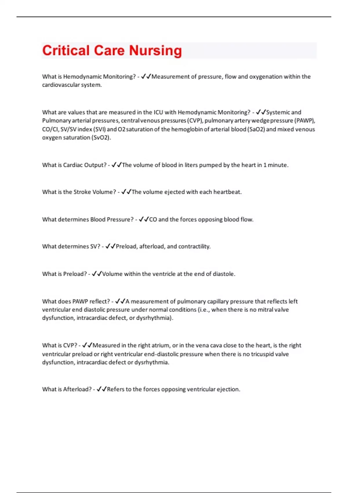 What is Hemodynamic Monitoring? - Measurement of pressure, flow and oxygenation within the cardiovascular system. What are values that are measured in the ICU with Hemodynamic Monitoring? - Systemic and Pulmonary arterial pressures, central venous pressures (CVP), pulmonary artery wedge pressure (PAWP), CO/CI, SV/SV index (SVI) and O2 saturation of the hemoglobin of arterial blood (SaO2) and mixed venous oxygen saturation (SvO2). What is Cardiac Output? - The volume of blood in liters pumped by the heart in 1 minute. What is the Stroke Volume? - The volume ejected with each heartbeat. What determines Blood Pressure? - CO and the forces opposing blood flow. What determines SV? - Preload, afterload, and contractility. What is Preload? - Volume within the ventricle at the end of diastole. What does PAWP reflect? - A measurement of pulmonary capillary pressure that reflects left ventricular end diastolic pressure under normal conditions (i.e., when there is no mitral valve dysfunction, intracardiac defect, or dysrhythmia). What is CVP? - Measured in the right atrium, or in the vena cava close to the heart, is the right ventricular preload or right ventricular end-diastolic pressure when there is no tricuspid valve dysfunction, intracardiac defect or dysrhythmia. What is Afterload? - Refers to the forces opposing ventricular ejection.