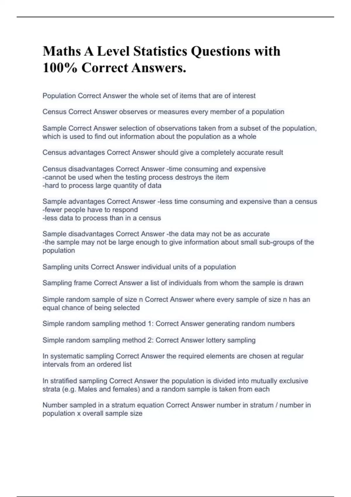 Maths A Level Statistics Questions with 100% Correct Answers.