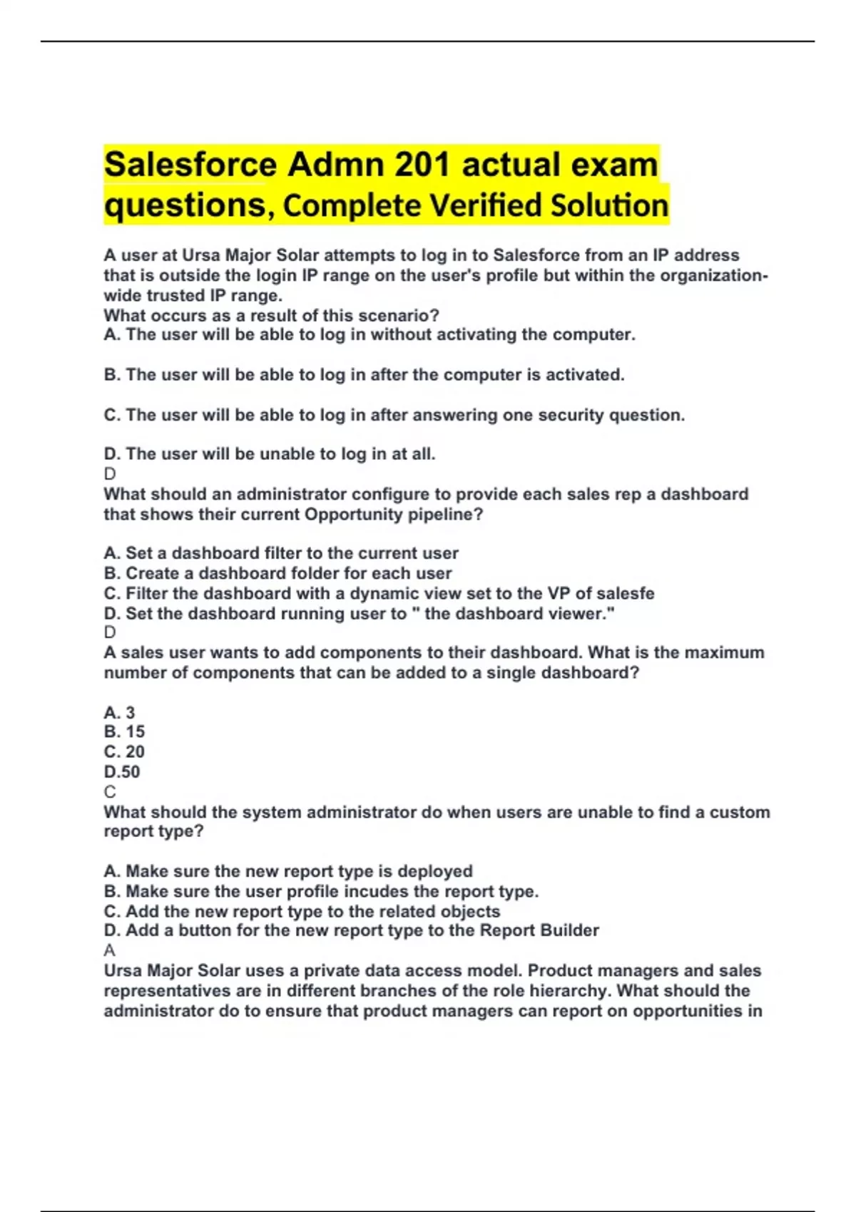 Salesforce Admn 201 actual exam questions, Complete Verified Solution A user at Ursa Major Solar attempts to log in to Salesforce from an IP address that is outside the login IP range on the user's profile but within the organization-wide trusted IP range. What occurs as a result of this scenario? A. The user will be able to log in without activating the computer. B. The user will be able to log in after the computer is activated. C. The user will be able to log in after answering one security question. D. The user will be unable to log in at all. D What should an administrator configure to provide each sales rep a dashboard that shows their current Opportunity pipeline? A. Set a dashboard filter to the current user B. Create a dashboard folder for each user C. Filter the dashboard with a dynamic view set to the VP of salesfe D. Set the dashboard running user to " the dashboard viewer." D A sales user wants to add components to their dashboard. What is the maximum number of components that can be added to a single dashboard? A. 3 B. 15 C. 20 D.50 C What should the system administrator do when users are unable to find a custom report type? A. Make sure the new report type is deployed B. Make sure the user profile incudes the report type. C. Add the new report type to the related objects D. Add a button for the new report type to the Report Builder A Ursa Major Solar uses a private data access model. Product managers and sales representatives are in different branches of the role hierarchy. What should the administrator do to ensure that product managers can report on opportunities in their product line? A. Create a sharing rule based on criteri