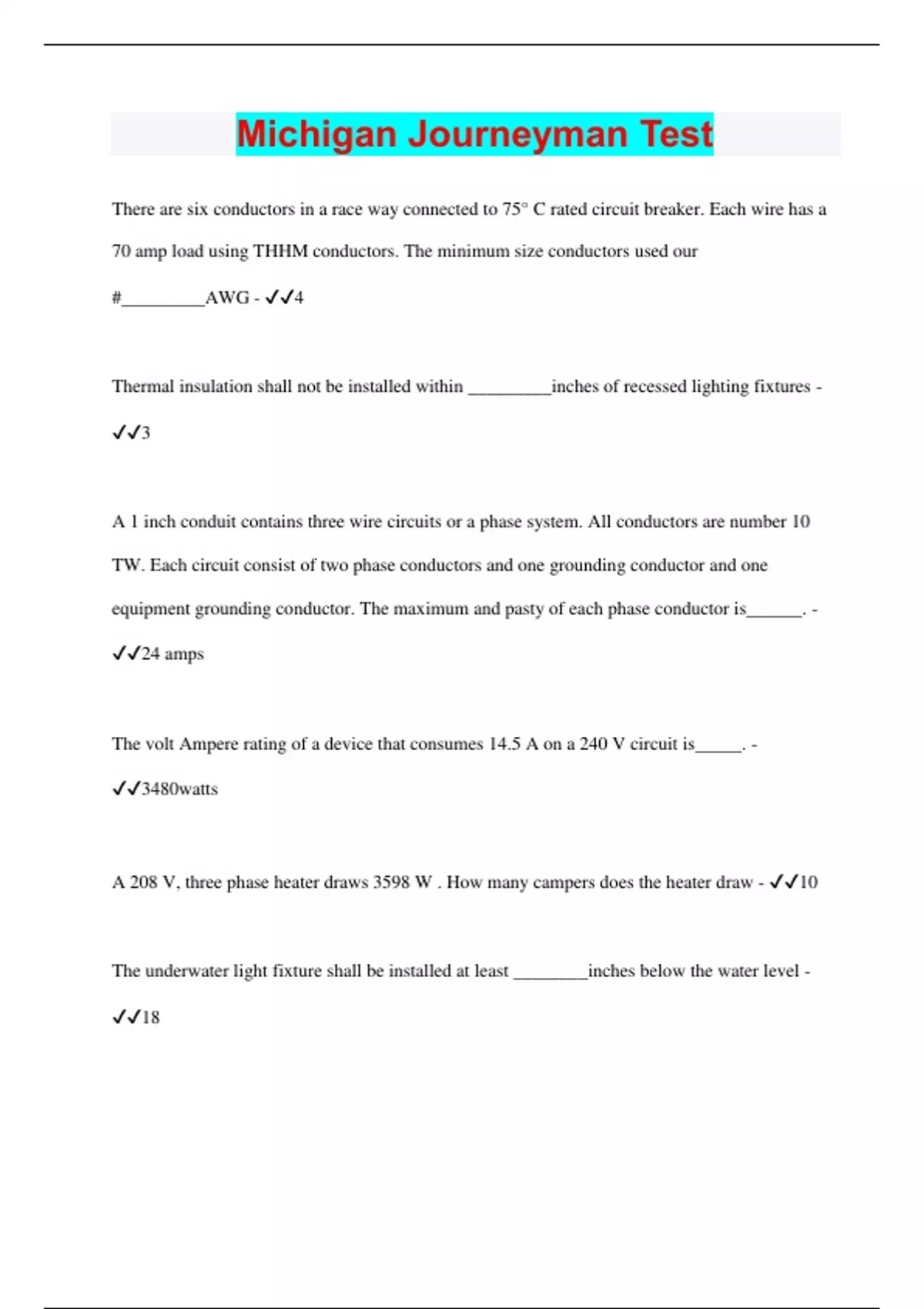 There are six conductors in a race way connected to 75° C rated circuit breaker. Each wire has a 70 amp load using THHM conductors. The minimum size conductors used our #_________AWG - 4 Thermal insulation shall not be installed within _________inches of recessed lighting fixtures - 3 A 1 inch conduit contains three wire circuits or a phase system. All conductors are number 10 TW. Each circuit consist of two phase conductors and one grounding conductor and one equipment grounding conductor. The maximum and pasty of each phase conductor is______. - 24 amps The volt Ampere rating of a device that consumes 14.5 A on a 240 V circuit is_____. - 3480watts A 208 V, three phase heater draws 3598 W . How many campers does the heater draw - 10 The underwater light fixture shall be installed at least ________inches below the water level - 18