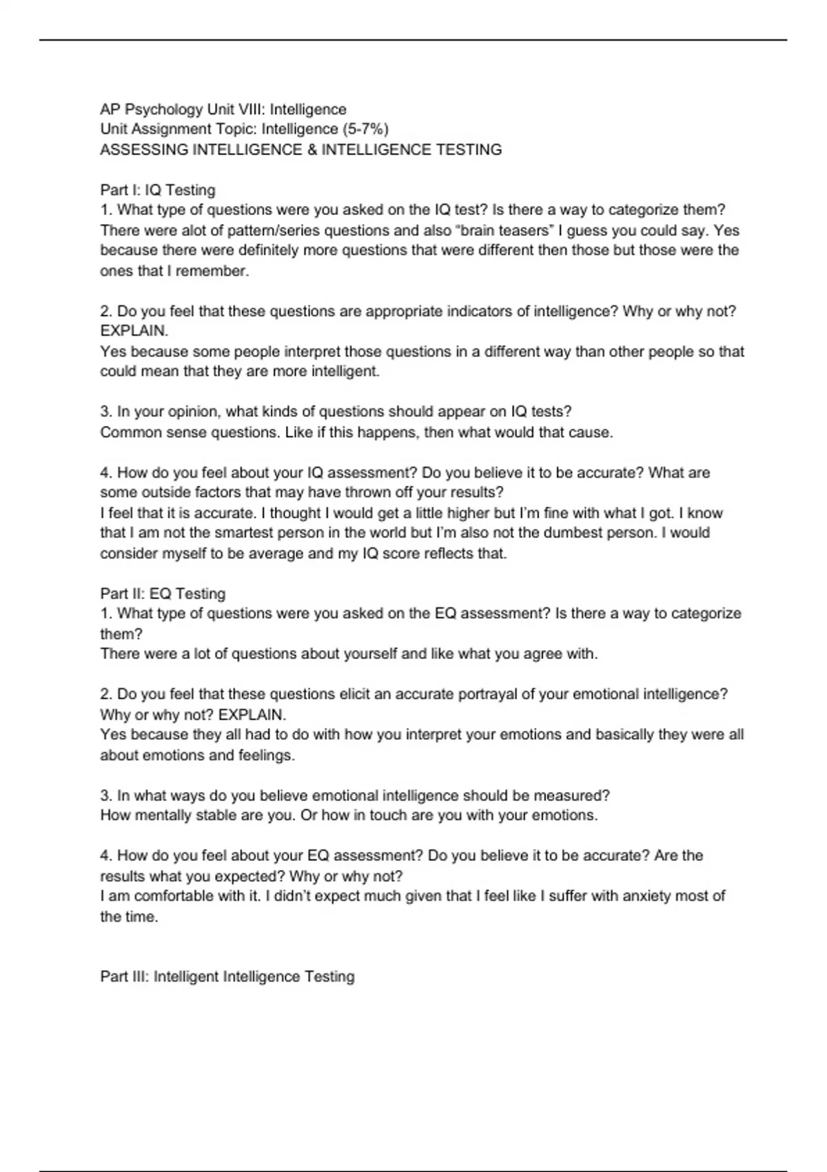 Summary ASSESSING INTELLIGENCE & INTELLIGENCE TESTING