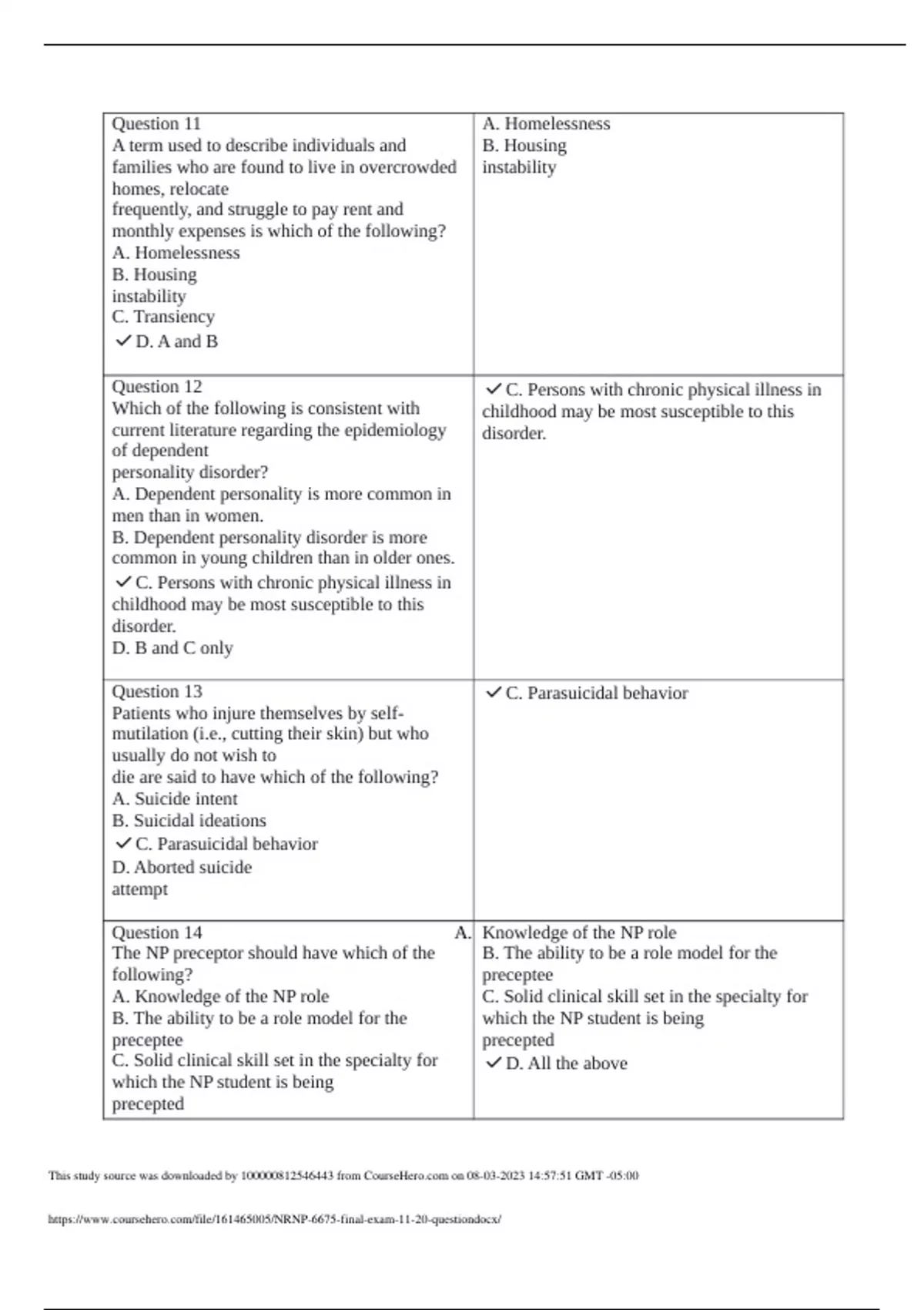 Question 11 A term used to describe individuals and families who are found to live in overcrowded homes, relocate frequently, and struggle to pay rent and monthly expenses is which of the following? A. Homelessness B. Housing instability C. Transiency ️D. A and B A. Homelessness B. Housing instability Question 12 Which of the following is consistent with current literature regarding the epidemiology of dependent personality disorder? A. Dependent personality is more common in men than in women. B. Dependent personality disorder is more common in young children than in older ones. ️C. Persons with chronic physical illness in childhood may be most susceptible to this disorder. D. B and C only ️C. Persons with chronic physical illness in childhood may be most susceptible to this d