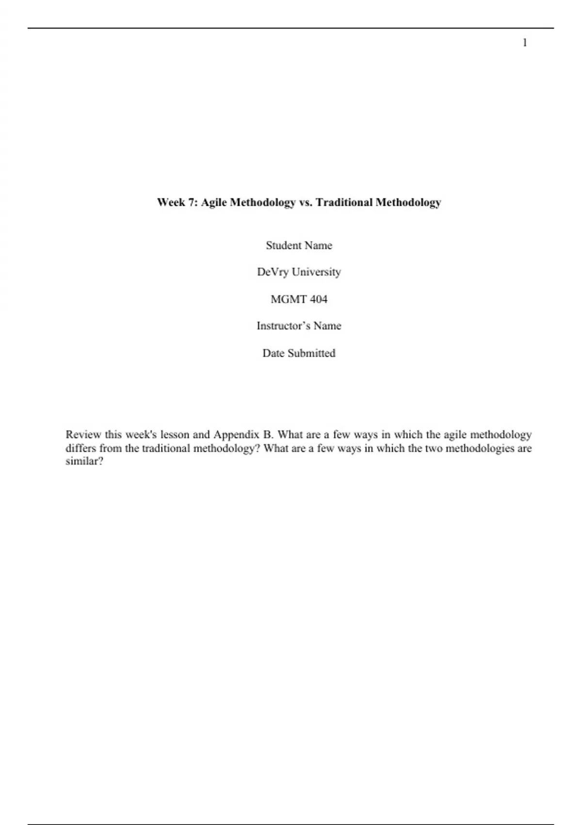MGMT 404 Week 7 Discussion Agile Methodology vs. Traditional Methodology Devry