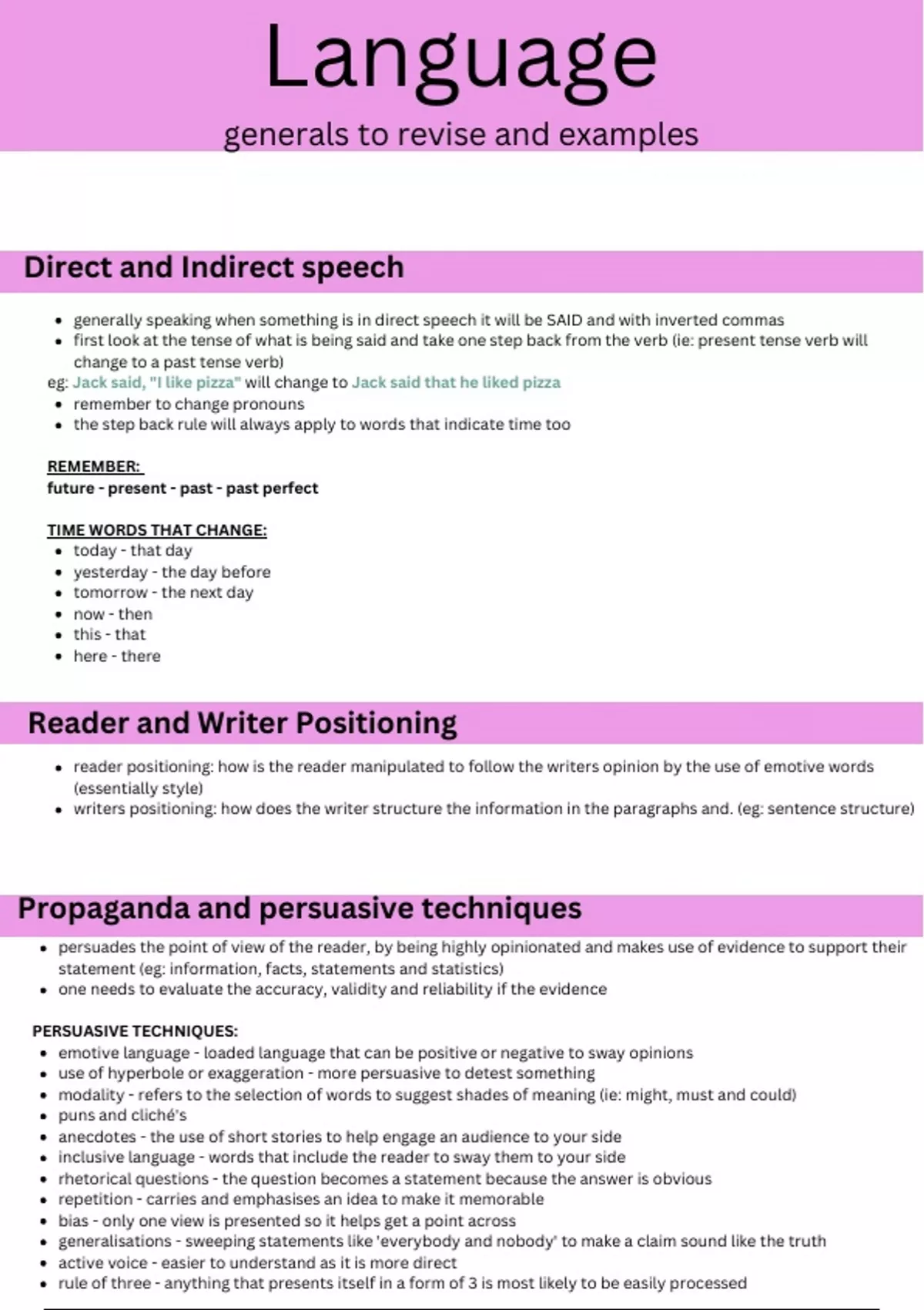 generalisations - sweeping statements like 'everybody and nobody' to make a claim sound like the truth