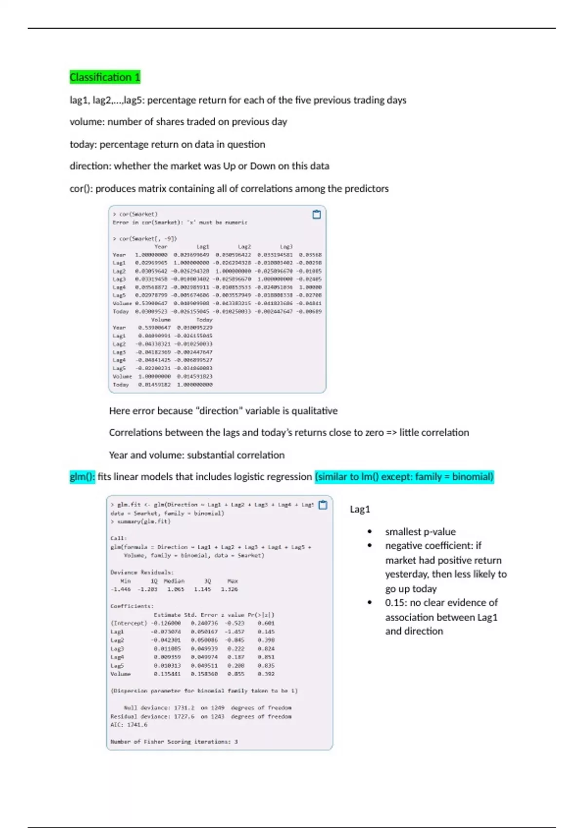 predict(): can be used for the probability that the market will go up, given values of predictors