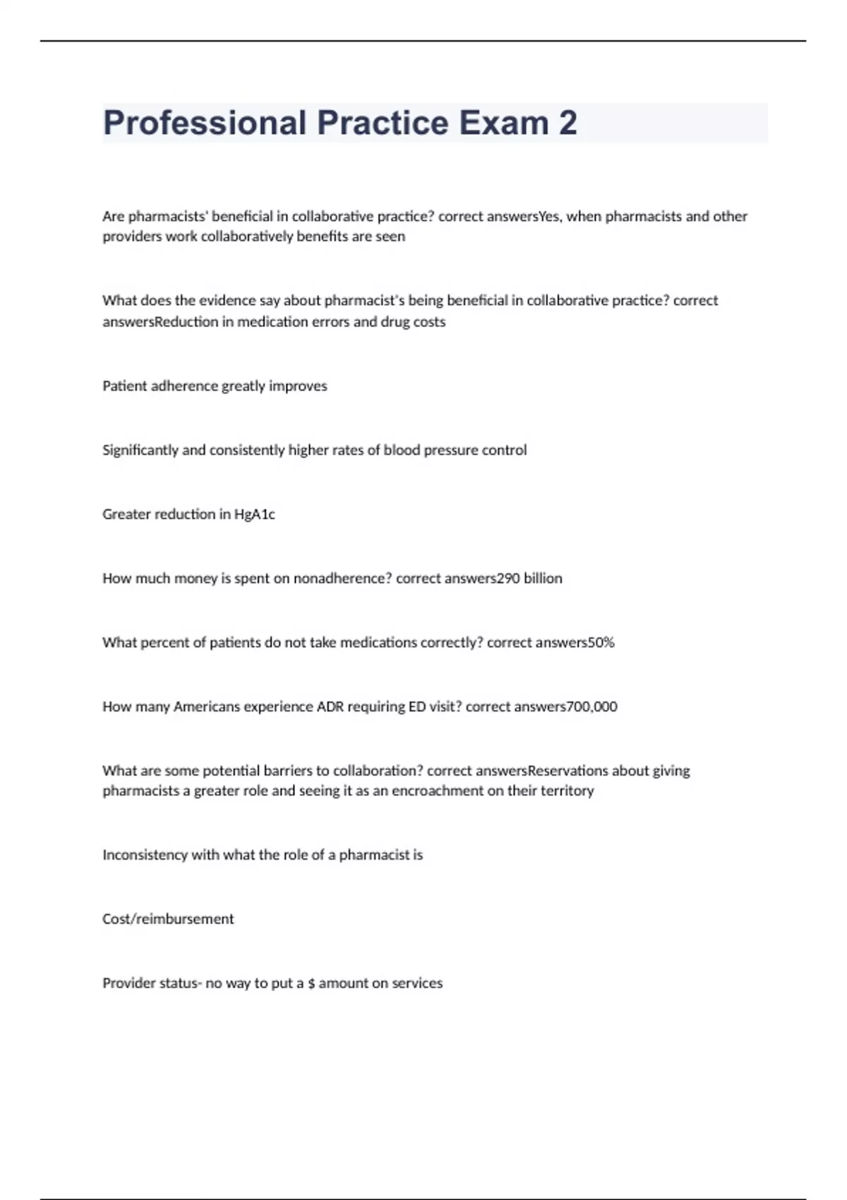 Are pharmacists' beneficial in collaborative practice? correct answersYes, when pharmacists and other providers work collaboratively benefits are seen What does the evidence say about pharmacist's being beneficial in collaborative practice? correct answersReduction in medication errors and drug costs Patient adherence greatly improves Significantly and consistently higher rates of blood pressure control Greater reduction in HgA1c How much money is spent on nonadherence? correct answers290 billion What percent of patients do not take medications correctly? correct answers50% How many Americans experience ADR requiring ED visit? correct answers700,000 What are some potential barriers to collaboration? correct answersReservations about giving pharmacists a greater role and seeing it as an encroachment on their territory Inconsistency with what the role of a pharmacist is