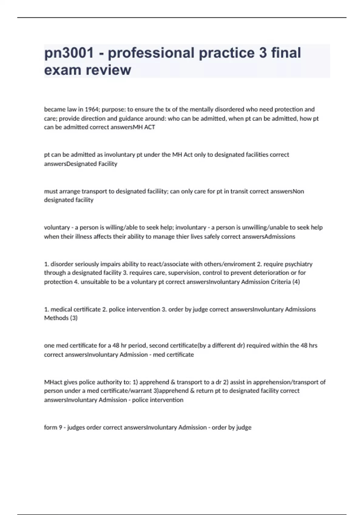 became law in 1964; purpose: to ensure the tx of the mentally disordered who need protection and care; provide direction and guidance around: who can be admitted, when pt can be admitted, how pt can be admitted correct answersMH ACT pt can be admitted as involuntary pt under the MH Act only to designated facilities correct answersDesignated Facility must arrange transport to designated faciliity; can only care for pt in transit correct answersNon designated facility voluntary - a person is willing/able to seek help; involuntary - a person is unwilling/unable to seek help when their illness affects their ability to manage thier lives safely correct answersAdmissions 1. disorder seriously impairs ability to react/associate with others/enviroment 2. require psychiatry through a designated facility 3. requires care, supervision, control to prevent deterioration or for protection 4. unsuitable to be a voluntary pt correct answersInvoluntary Admission Criteria (4) 1. medical certificate 2. police intervention 3. order by judge correct answersInvoluntary Admissions Methods (3) one med certificate for a 48 hr period, second certificate(by a different dr) required within the 48 hrs correct answersInvoluntary Admission - med certificate MHact gives police authority to: 1) apprehend & transport to a dr 2) assist in apprehension/transport of person under a med certificate/warrant 3)apprehend & return pt to designated facility correct answersInvoluntary Admission - police intervention