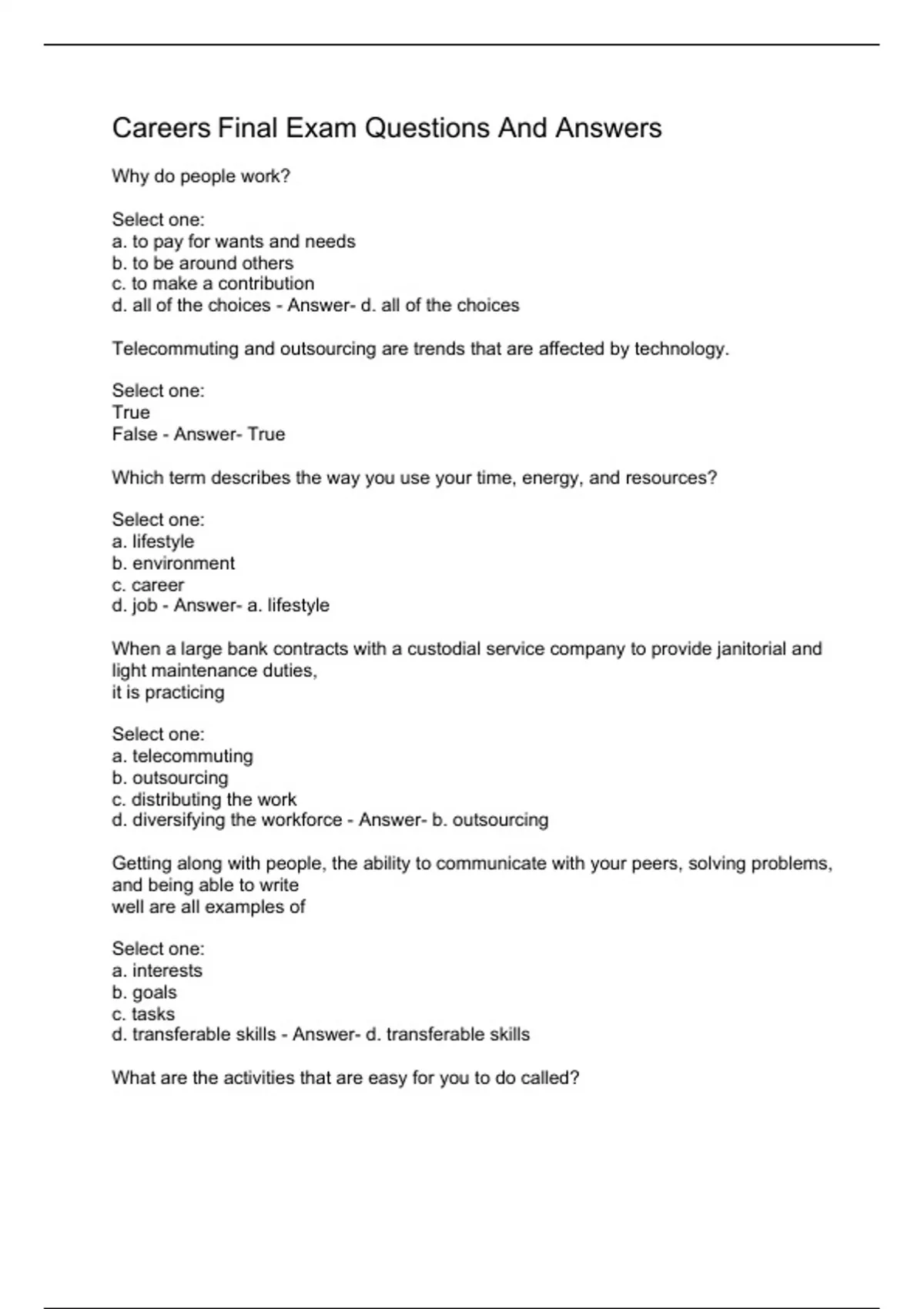 Why do people work? Select one: a. to pay for wants and needs b. to be around others c. to make a contribution d. all of the choices - Answer- d. all of the choices Telecommuting and outsourcing are trends that are affected by technology. Select one: True False - Answer- True Which term describes the way you use your time, energy, and resources? Select one: a. lifestyle b. environment c. career d. job - Answer- a. lifestyle When a large bank contracts with a custodial service company to provide janitorial and light maintenance duties, it is practicing Select one: a. telecommuting b. outsourcing c. distributing the work d. diversifying the workforce - Answer- b. outsourcing Getting along with people, the ability to communicate with your peers, solving problems, and being able to write well are all examples of Select one: a. interests b. goals c. tasks d. transferable skills - Answer- d. transferable skills What are the activities that are easy for you to do called?