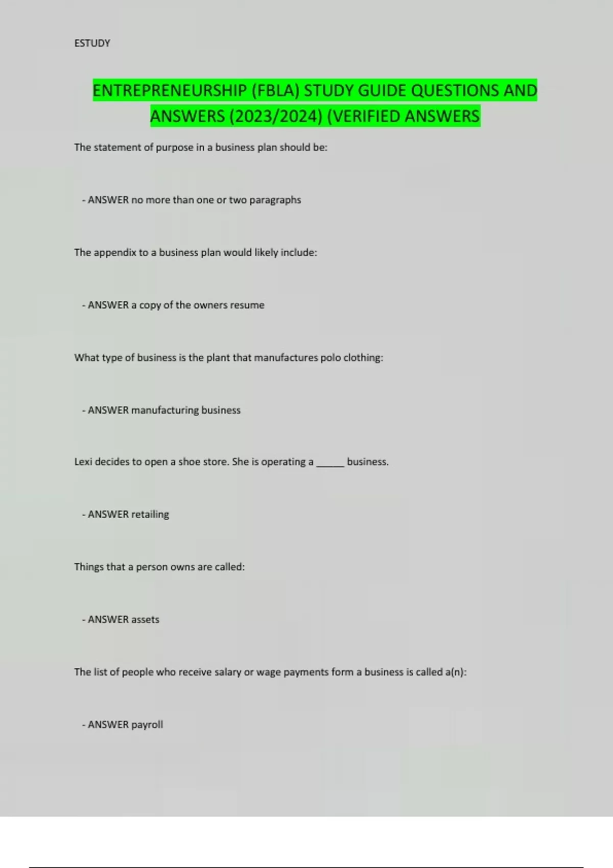 ENTREPRENEURSHIP (FBLA) STUDY GUIDE QUESTIONS AND ANSWERS (2023/2024) (VERIFIED ANSWERS