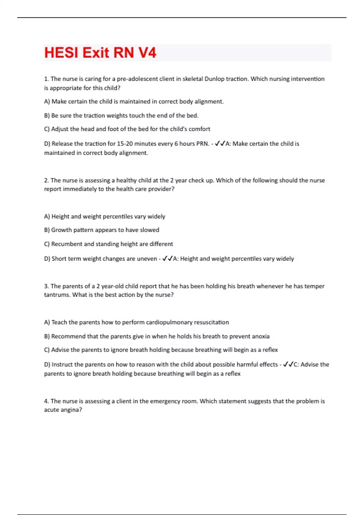 1. The nurse is caring for a pre-adolescent client in skeletal Dunlop traction. Which nursing intervention is appropriate for this child? A) Make certain the child is maintained in correct body alignment. B) Be sure the traction weights touch the end of the bed. C) Adjust the head and foot of the bed for the child's comfort D) Release the traction for 15-20 minutes every 6 hours PRN. - A: Make certain the child is maintained in correct body alignment. 2. The nurse is assessing a healthy child at the 2 year check up. Which of the following should the nurse report immediately to the health care provider? A) Height and weight percentiles vary widely B) Growth pattern appears to have slowed C) Recumbent and standing height are different D) Short term weight changes are uneven - A: Height and weight percentiles vary widely 3. The parents of a 2 year-old child report that he has been holding his breath whenever he has temper tantrums. What is the best action by the nurse? A) Teach the parents how to perform cardiopulmonary resuscitation B) Recommend that the parents give in when he holds his breath to prevent anoxia C) Advise the parents to ignore breath holding because breathing will begin as a reflex D) Instruct the parents on how to reason with the child about possible harmful effects - C: Advise the parents to ignore breath holding because breathing will begin as a reflex 4. The nurse is assessing a client in the emergency room. Which statement suggests that the problem is acute angina?A) "My pain is deep in my chest behind my sternum." B) "When I sit up the pain gets worse." C) "As I take a deep breath the pain gets worse." D) "The pain is right here in my stomach area." - A: "My pain is deep in my chest behind my sternum.