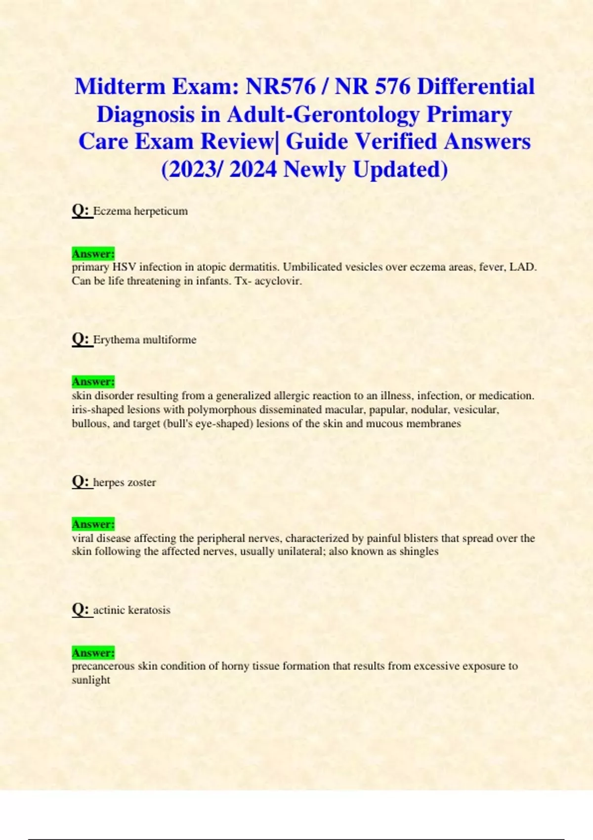 Midterm Exam: NR576 / NR 576 Differential Diagnosis in Adult-Gerontology Primary Care Exam Review| Guide Verified Answers (2023/ 2024 Newly Updated) Q: Eczema herpeticum Answer: primary HSV infection in atopic dermatitis. Umbilicated vesicles over eczema areas, fever, LAD. Can be life threatening in infants. Tx- acyclovir. Q: Erythema multiforme Answer: skin disorder resulting from a generalized allergic reaction to an illness, infection, or medication. iris-shaped lesions with polymorphous disseminated macular, papular, nodular, vesicular, bullous, and target (bull's eye-shaped) lesions of the skin and mucous membranes Q: herpes zoster Answer: viral disease affecting the peripheral nerves, characterized by painful blisters that spread over the skin following the affected nerves, usually unilateral; also known as shingles Q: actinic keratosis Answer: precancerous skin condition of horny tissue formation that results from excessive exposure to sunlight Q: basal cell carcinoma Answer: malignant tumor of the basal cell layer of the epidermis. Elevated papules that have a pearly appearance, with some crusting. Slow progression without pain, Occurs in sun-exposed areas, Often on face, May ooze, crust, or bleed. A spot or a bump that is getting larger or a sore that is not healing. Appears as a thick, rough patch that may bleed if scratched or scraped. Some patients think they are warts with a raised border and crusted surface Q: squamous cell carcinoma Answer: Type of skin cancer more serious than basal cell carcinoma; firm papule with a scaly (keratotic) rough surface with irregular borders. These lesions may even present as cutaneous horns, with columnar hyperkeratosis atop an erythematous base Q: Melanoma Answer: Asymmetrical, Border- irregular, Color- dark or uneven, Diameter- >6mm, Evolution- change in shape, size, color, "Ugly duckling" - does not resemble other moles or skin growths on the body, Refer to dermatology Q: acne vulgaris Answer: open and closed comedones, found on face, sometimes body. Painful and tenderness from multiple deep pustules, nodules, and cysts Q: furuncle