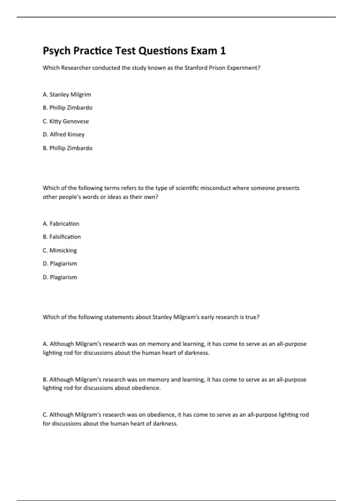 Which Researcher conducted the study known as the Stanford Prison Experiment? A. Stanley Milgrim B. Phillip Zimbardo C. Kitty Genovese D. Alfred Kinsey B. Phillip Zimbardo Which of the following terms refers to the type of scientific misconduct where someone presents other people's words or ideas as their own? A. Fabrication B. Falsification C. Mimicking D. Plagiarism D. Plagiarism