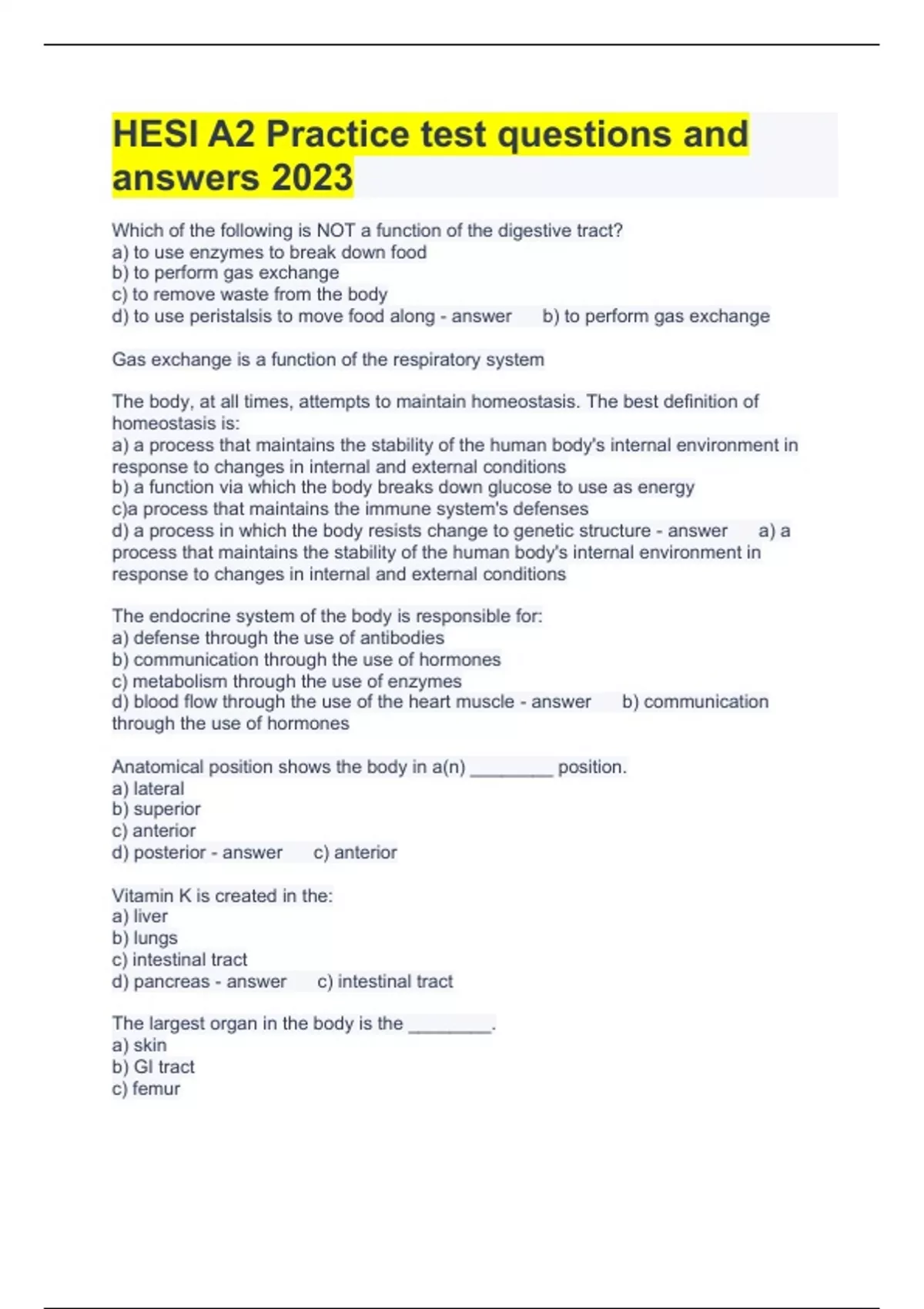 HESI A2 Practice test questions and answers 2023 Which of the following is NOT a function of the digestive tract? a) to use enzymes to break down food b) to perform gas exchange c) to remove waste from the body d) to use peristalsis to move food along b) to perform gas exchange Gas exchange is a function of the respiratory system The body, at all times, attempts to maintain homeostasis. The best definition of homeostasis is: a) a process that maintains the stability of the human body's internal environment in response to changes in internal and external conditions b) a function via which the body breaks down glucose to use as energy c)a process that maintains the immune system's defenses d) a process in which the body resists change to genetic structure a) a process that maintains the stability of the human body's internal environment in response to changes in internal and external conditions The endocrine system of the body is responsible for: a) defense through the use of antibodies b) communication through the use of hormones c) metabolism through the use of enzymes d) blood flow through the use of the heart muscle b) communication through the use of hormones Anatomical position shows the body in a(n) ________ position. a) lateral b) superior c) anterior d) posterior c) anterior Vitamin K is created in the: a) liver b) lungs c) intestinal tract d) pancreas c) intestinal tract The largest organ in the body is the ________. a) skin b) GI tract c) femur d) stomach a) skin A medical scientists wants to study the parenchyma of the kidney. This scientist would correctly be known, most specifically, as a: a) biologist b) doctor c) anatomist d) histologist d) histologist Histology is the study of tissues. What is Erythropoiesis? a) red blood cell formation b) white blood cell formation c) the destruction of red blood cells d) the destruction of white blood cells a) red blood cell formation Blood cell formation is called Hemopoiesis. Erythro- red blood cells In which part of the body is keratin NOT found? a) hair b) skin c) nails d) teeth d) teeth Keratin is a family of fibrous structural proteins. Keratin is the key structural component of hair, nails, and the outer layer of human skin What is the relationship between sarcomeres and muscle cells? a) sarcomeres are muscle cells b) sarcomeres contain muscle cells c) muscle cells contain myofibrils, which in turn are made up of sarcomeres d) muscle cells contain sarcomeres, which in turn are made up of myofibrils c) muscle cells contain myofibrils, which in turn are made up of sarcomeres A person who has torn their vastus lateralis muscle will need which of the following? a) an arm sling b) a cane or crutches c) insulin d) a neck brace b) a cane or crutches The vastus lateralis muscle is a voluntary muscle in the legs. It is part of the quadriceps. Muscles produce contraction due to the sliding of: a) filaments b) sarcomeres c) flexors d) neutrons a) filaments During muscle contraction, filaments slide together by using energy supplied by ATP. The medulla oblongata has what primary responsibility? a) balance b) intellect c) vital functions d) sensory input c) vital functions The medulla oblongata is responsible for basic vital functions, including respiration and heart rate. Which of the following is true about simple reflexes? a) they travel through the entire body b) they travel only through the spinal cord c) they travel only through the brain d) they do not travel and remain localized b) they travel only through the spinal cord Simple reflexes, known also as spinal reflexes, travel only through the spinal cord, and do not reach the brain. What is the primary role of estrogen in the female reproductive system? a) it initiates the preparation of the endometrium for pregnancy b) it triggers the release of the egg from the ovary c) it causes fertilization d) it triggers the production of breast milk a) it initiates the preparation of the endometrium for pregnancy What is the name of the structure that transfers urine from the kidneys to the bladder? -ureters Humans can survive most easily without which of the following? a) pancreas b) lungs c) gallbladder d) bladder c) gallbladder The gallbladder's function is to store bile, but the GI tract is more than capable of producing bile to digest fat without it. Which of the following is NOT a role of cortisol? a) reducing inflammation b) raising the blood sugar level c) inhibiting the release of histamine d) controlling motor impulses d) controlling motor impulses How many pairs of spinal nerves are known to exit the spinal cord? -31 The spinal cord reaches from the base of the skull to the first or second lumbar vertebra. The base of the skull is also known as: a) foremen magnum b) filaments c) cerebellum d) corpus callosum a) foremen magnum Cyclic adenosine monophosphate is a substance that performs which of the following? a) acts as part of the cell membrane b) acts as energy for the cell c) acts as a secondary messenger d) acts as a hormone c) acts as a secondary messenger (cyclic AMP) The neuron is composed of a/n ________, which transmits signals toward the cell body, and a/n ________, which transmits signals away from the cell body. -dendrite, axon The pectoralis major muscle is located in which general area? -the chest The soleus muscle is located in which general area? -the legs Which of the following is responsible for differentiation, or specialization, of cells? a) platelets b) hormones c) neurons d) brain cells b) hormones What makes up the alimentary canal? -it consists of mouth, pharynx, esophagus, stomach, small intestine, large intestine, rectum, and anus. (digestive tract) A woman's body usually ovulates around what day in a normal 30-day cycle? -day 14 Sperm, once created, are stored in an area of the male body called the ________. -epididymis Which of these is the best analogy describing the function of the kidneys? a) a waste treatment plant b) a control center c) a medical facili