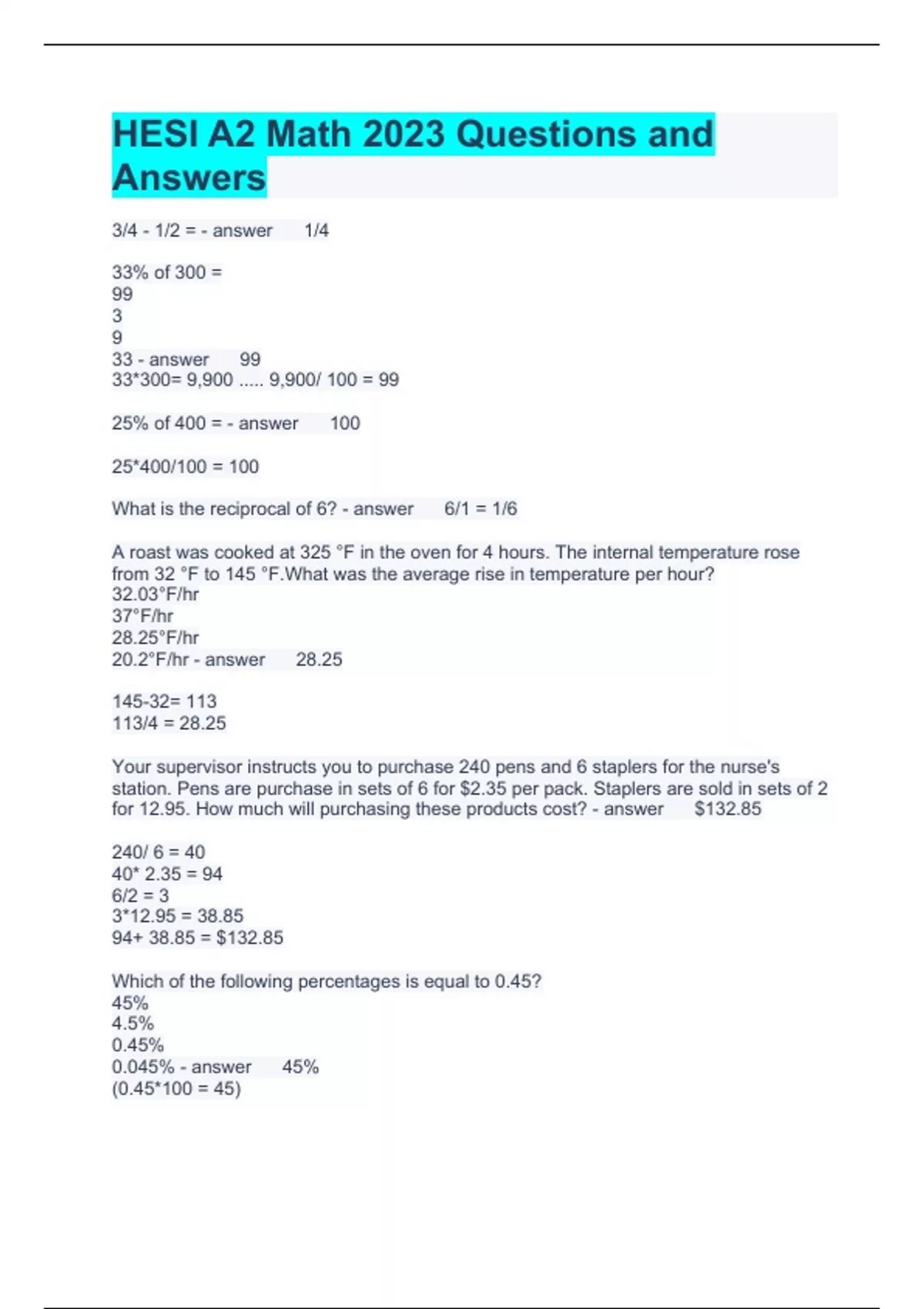 HESI A2 Math 2023 Questions and Answers 3/4 - 1/2 = 1/4 33% of 300 = 99 3 9 33 99 33*300= 9,900 ..... 9,900/ 100 = 99 25% of 400 = 100 25*400/100 = 100 What is the reciprocal of 6? 6/1 = 1/6 A roast was cooked at 325 °F in the oven for 4 hours. The internal temperature rose from 32 °F to 145 °F.What was the average rise in temperature per hour? 32.03°F/hr 37°F/hr 28.25°F/hr 20.2°F/hr 28.25 145-32= 113 113/4 = 28.25 Your supervisor instructs you to purchase 240 pens and 6 staplers for the nurse's station. Pens are purchase in sets of 6 for $2.35 per pack. Staplers are sold in sets of 2 for 12.95. How much will purchasing these products cost? $132.85 240/ 6 = 40 40* 2.35 = 94 6/2 = 3 3*12.95 = 38.85 94+ 38.85 = $132.85 Which of the following percentages is equal to 0.45? 45% 4.5% 0.45% 0.045% 45% (0.45*100 = 45) A vitamin's expiration date has passed. It was supposed to contain 500 mg of Calcium, but it has lost 325 mg of Calcium. How many mg of Calcium is left? 175 mg (500mg- 325mg = 175mg) You have orders to give a patient 20 mg of a certain medication. The medication is stored 4 mg per 5-mL dose. How many milliliters will need to be given? 30 mL 25 mL 20 mL 15 mL 25ml In the number 743.25 which digit represents the tenths space? 3 4 2 5 2 Which of these percentages equals 1.25? 1250% 12.5% 125% 0.125% 125% (1.25*100=125) If the average person drinks 8, (8oz) glasses of water per day, a person who drinks 12.8 oz of water after a morning exercise session has consumed what fraction of the daily average? 1/3 1/9 1/7 1/5 1/5 (12.8 / 64 = 0.20. 0.20= 20/100, reduce 20/100 to 1/5) In your class there are 48 student; 32 students are female. Approximately what percentage is male? 25% 33% 66% 45% 33% (48-32 = 16.......... 16/48= 0.33) Fried's rule for computing an infant's dose of medication is:infant's dose = ( Child's age in months x adult dose) / 150If the adult dose of medication is 15 mg, how much should be given to a 2 year-old child? 1.2 2.4 3.6 4.8 2.4 (24months*15mg/150 = 2.4