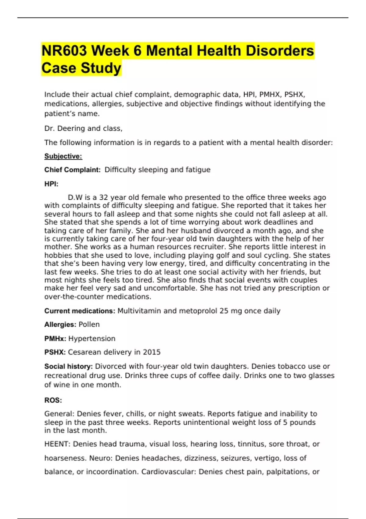 nr603 week 6 mental health disorders case study