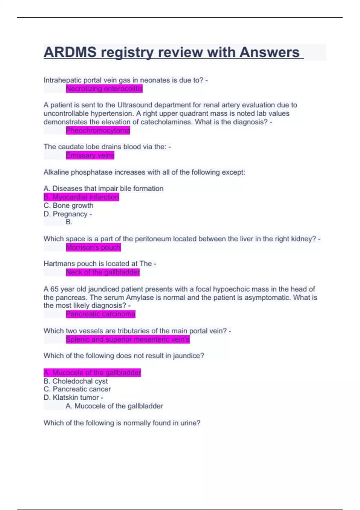 Intrahepatic portal vein gas in neonates is due to? - Necrotizing enterocolitis A patient is sent to the Ultrasound department for renal artery evaluation due to uncontrollable hypertension. A right upper quadrant mass is noted lab values demonstrates the elevation of catecholamines. What is the diagnosis? - Pheochromocytoma The caudate lobe drains blood via the: - Emissary veins Alkaline phosphatase increases with all of the following except: A. Diseases that impair bile formation B. Myocardial infarction C. Bone growth D. Pregnancy - B. Which space is a part of the peritoneum located between the liver in the right kidney? - Morrison's pouch Hartmans pouch is located at The - Neck of the gallbladder