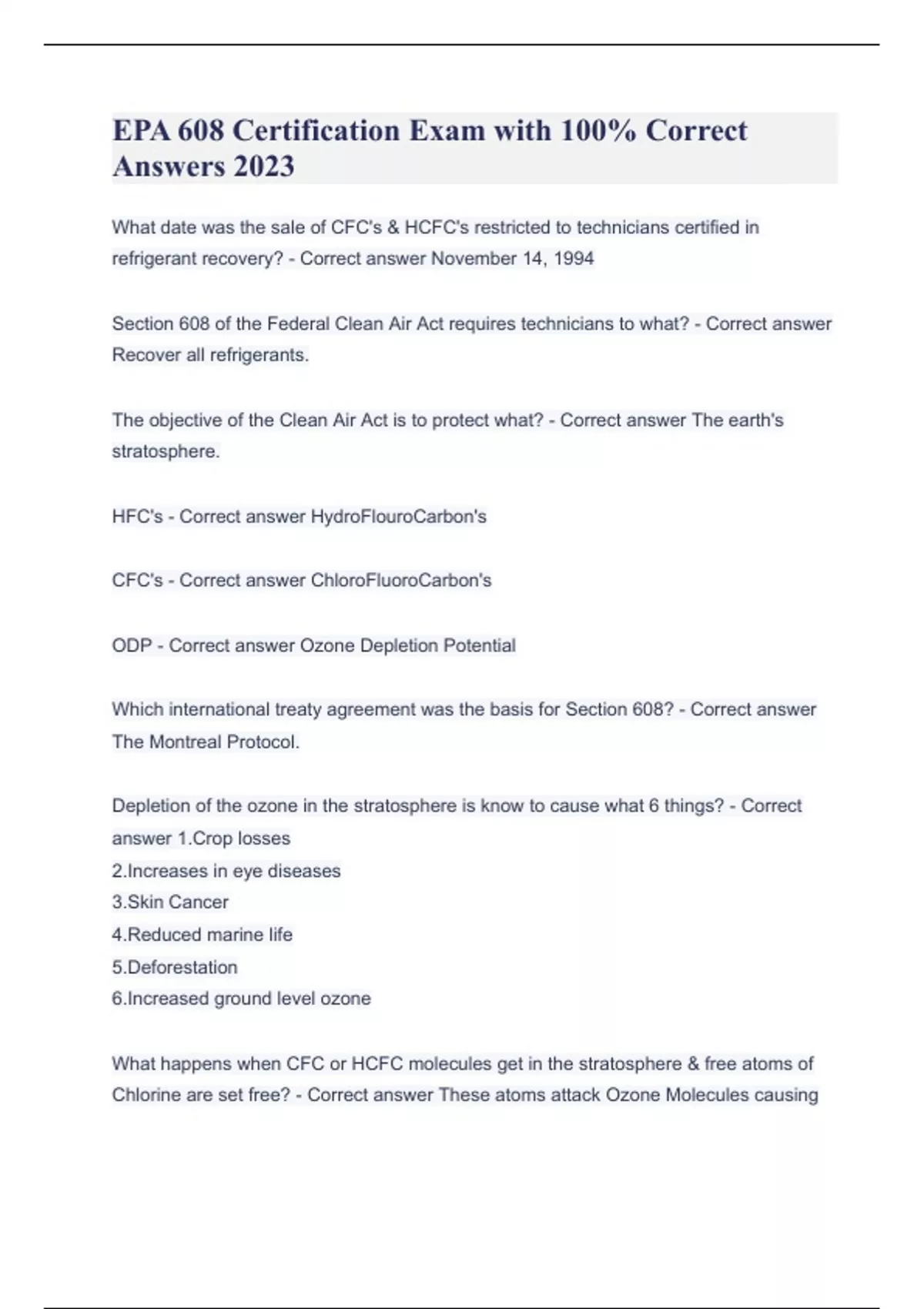 EPA 608 Certification Exam with 100% Correct Answers 2023 EPA 608 Certification Exam with 100% Correct Answers 2023