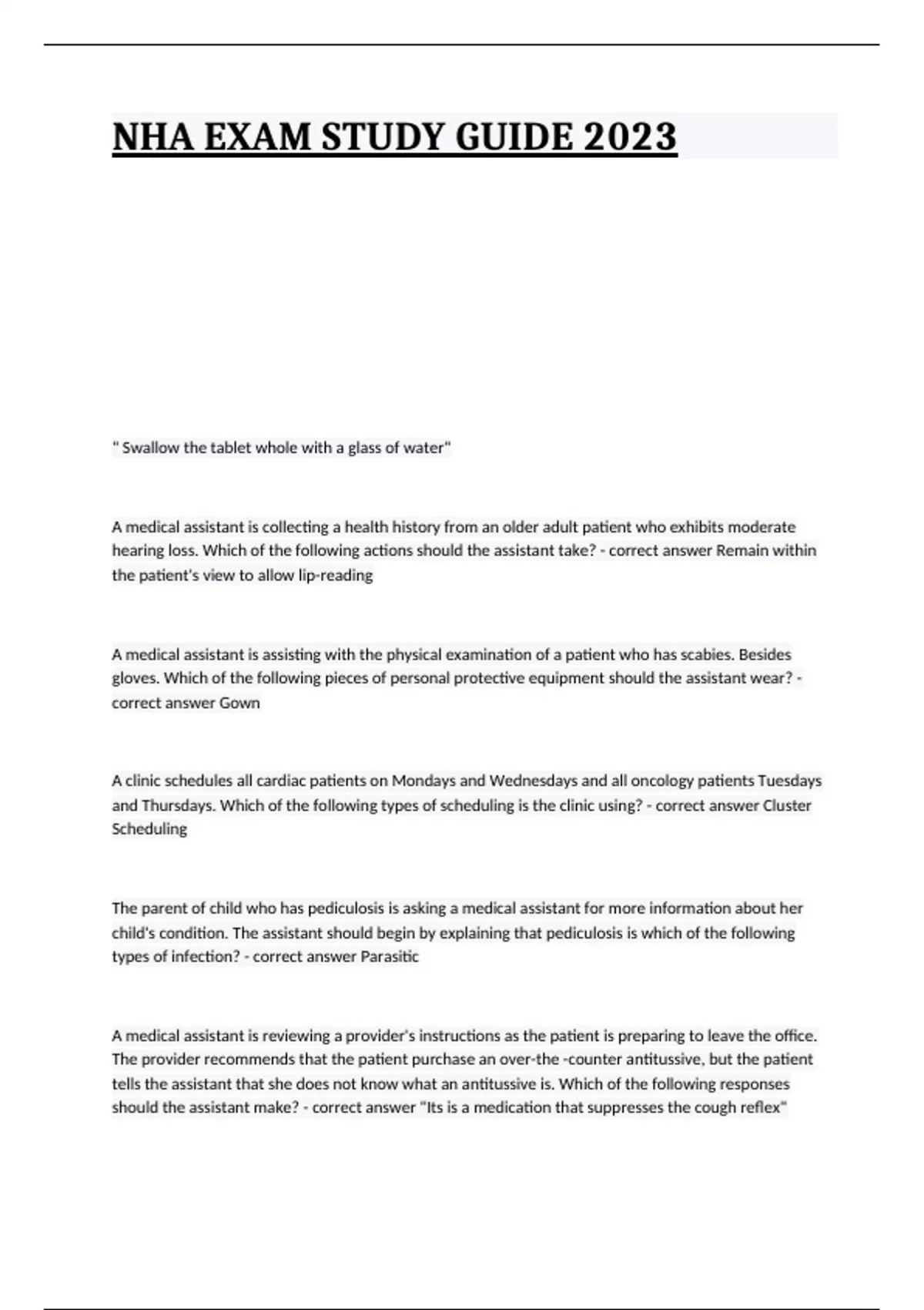 NHA EXAM STUDY GUIDE 2023 " Swallow the tablet whole with a glass of water" A medical assistant is collecting a health history from an older adult patient who exhibits moderate hearing loss. Which of the following actions should the assistant take? - correct answer Remain within the patient's view to allow lip-reading A medical assistant is assisting with the physical examination of a patient who has scabies. Besides gloves. Which of the following pieces of personal protective equipment should the assistant wear? - correct answer Gown A clinic schedules all cardiac patients on Mondays and Wednesdays and all oncology patients Tuesdays and Thursdays. Which of the following types of scheduling is the clinic using? - correct answer Cluster Scheduling The parent of child who has pediculosis is asking a medical assistant for more information about her child's condition. The assistant should begin by explaining that pediculosis is which of the following types of infection? - correct answer Parasitic A medical assistant is reviewing a provider's instructions as the patient is preparing to leave the office. The provider recommends that the patient purchase an over-the -counter antitussive, but the patient tells the assistant that she does not know what an antitussive is. Which of the following responses should the assistant make? - correct answer "Its is a medication that suppresses the cough reflex" When performing the palpatory method for obtaining blood pressure, which of the following indicates the level at which the medical assistant should inflate the cuff? - correct answer 30mm Hg above the radial pulse cessation A first time patient is late arriving to the office. Which of the following should the medical assistant say first? - correct answer " Hello, Welcome to our office" A medical assistant is administering an intramuscular immunization to a patient. Which of the following actions should the assistant take? - correct answer Cleanse the site in a circular motion from the center outward. A medical assistant is explaining a venipuncture procedure to a patient. Which of the following statements should the assistant take? - correct answer "I'll be collecting a blood sample from you today, There will be a small stick in your arm" A medical assistant is examining the skin on a patient's forearm where the patient reports developing a rash. The assistant notes multiple solid elevations that are less than 0.5 cm (0.2) in diameter. Which of the following terms should he use to document his observations in the patient's medical record? - correct answer Papules A patient tells a medical assistant that his provider's office is incompetent, as there is no improvement in his condition. Which of the following is an appropriate response for the assistant to make? - correct answer " I think that you feel that your treatment is not effective" A medical assistant is assisting a provider with an abdominal examination. When the provider palpates the major portion of the liver, the assistant should recognize that he is palpating which of the following abdominal quadrants? - correct answer Right Upper A patient is seen in an urgent care center for a laceration to the foot. The provider evaluates the injury, determines sutures are not needed, applies a dressing and release the patient. Which of the following levels of examinations should a medical assistant use for the procedural coding for this visit? - correct answer Problem-focused examination Which of the following information should a medical assistant enter into the appointment calendar when scheduling a patient for skin rash? - correct answer Daytime phone number A medical assistant discovers a garbage can fire has started in the back room of the medical office according to RACE acronym for emergency responses, which of the following actions should the assistant take first? - correct answer Evacuate staff and patients from the immediate area A medical assistant is encouraging her patient to increase her intake of insoluble fiber to help prevent constipation and hemorrhoids . Which of the following foods should the assistant recommend as the best food for insoluble fiber? - correct answer Pears with skin A medical assistant is preparing a patient who has congestive heart failure (CHF) for an examination by the provider. Which of the following manifestion should the assistant expect. - correct answer Shortness of breath A medical assistant is discussing information with a patient about a new medication that the provider prescribed. Which of the following actions should the assistant take? - correct answer Reinforce teaching about the frequency of medication administration