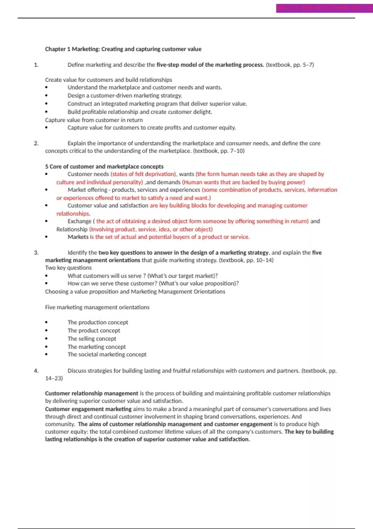 Define marketing and describe the five-step model of the marketing process. (textbook, pp. 5–7) Create value for customers and build relationships Understand the marketplace and customer needs and wants. Design a customer-driven marketing strategy. Construct an integrated marketing program that deliver superior value. Build profitable relationship and create customer delight. Capture value from customer in return Capture value for customers to create profits and customer equity. 2. Explain the importance of understanding the marketplace and consumer needs, and define the core concepts critical to the understanding of the marketplace. (textbook, pp. 7–10) 5 Core of customer and marketplace concepts Customer needs (states of felt deprivation), wants (the form human needs take as they are shaped by culture and individual personality) ,and demands (Human wants that are backed by buying power) Market offering - products, services and experiences (some combination of products, services, information or experiences offered to market to satisfy a need and want.) Customer value and satisfaction are key building blocks for developing and managing customer relationships. Exchange ( the act of obtaining a desired object form someone by offering something in return) and Relationship (Involving product, service, idea, or other object) Markets is the set of actual and potential buyers of a product or service. 3. Identify the two key questions to answer in the design of a marketing strategy, and explain the five marketing management orientations that guide marketing strategy. (textbook, pp. 10–14) Two key questions What customers will us serve ? (What’s our target market)? How can we serve these customer? (What’s our value proposition)? Choosing a value proposition and Marketing Management Orientations Five marketing management orientations The production concept The product concept The selling concept The marketing concept The societal marketing concept 4. Discuss strategies for building lasting and fruitful relationships with customers and partners. (textbook, pp. 14–23) Customer relationship management is the process of building and maintaining profitable customer relationships by delivering superior customer value and satisfaction. Customer engagement marketing aims to make a brand a meaningful part of consumer's conversations and lives through direct and continual customer involvement in shaping brand conversations, experiences. And community. The aims of customer relationship management and customer engagement is to produce high customer equity: the total combined customer lifetime values of all the company's customers. The key to building lasting relationships is the creation of superior customer value and satisfaction. MKTG 396 MIDTERM NOTES To build a good customer relationship, a good marketer should be working closely with marketing partner inside (company – different department, internally) and outside (supplier, channel partner and other, externally) the company to jointly bring more value to customer 5. Identify the outcomes of developing and maintaining lasting relationships with customers. (textbook, pp. 23–26) Creating customer loyalty and retention – the value of the entire stream of purchases a customer makes over a lifetime of patronage. Growing share of customer – the portion of the customer's purchasing that a company gets in its product categories. Building customer equity – the total combined customer lifetime values of all the company's customers. Building the right relationship with the right customer - Classifies customers into 4 relationship groups according to their profitability and projected loyalty. Strangers show low potential profitability and little projected loyalty which a little fit between the company's offerings and needs. Butterflies are potentially profitable but not loyal. There is a good fit between the company’s offerings and needs but just only short term! True friends are both potential and loyal which is a strong fit and the firm wants to make continual relationship investments. Barnacles are highly loyal but not profitable. There is a limited fit. Barnacles are perhaps the most problematic customers. Different types of customers require different relationship management strategies but the goal is to build the right relationships with the right customers. 6. Describe the major challenges facing marketers. (textbook, pp. 26–32) The major trends and forces that are changing the marketing landscape and challenging marketing strategy - 5 major developments The digital age - online, mobile and social media marketing; the use of digital marketing tools in order to engage consumers anywhere and at any time via their digital devices. The changing economic environment - Many consumers are reconsidering their definition of good life. The growth of not for profit marketing- social marketing campaign Rapid globalization - countries around the world are increasingly taking global viewing of the company's industry, competitors and forces affect businesses. Ethics and Social responsibility - relationships with social values and responsibilities and with the Earth that sustain us. It is being call sustainable marketing Reviewing the Concepts LO1 Define Marketing and Outline the Steps in the Marketing Process. Marketing is the process by which companies create value for customers and build strong customer relationships in order to capture value from customers in return. The marketing process involves five steps. The first four steps create value for customers. First, marketers need to understand the marketplace and customer needs and wants. Next, marketers design a customer-driven marketing strategy with the goal of getting, keeping, and growing target customers. In the third step, marketers construct a marketing program that actually delivers superior value. All of these steps form the basis for the fourth step, building profitable customer relati