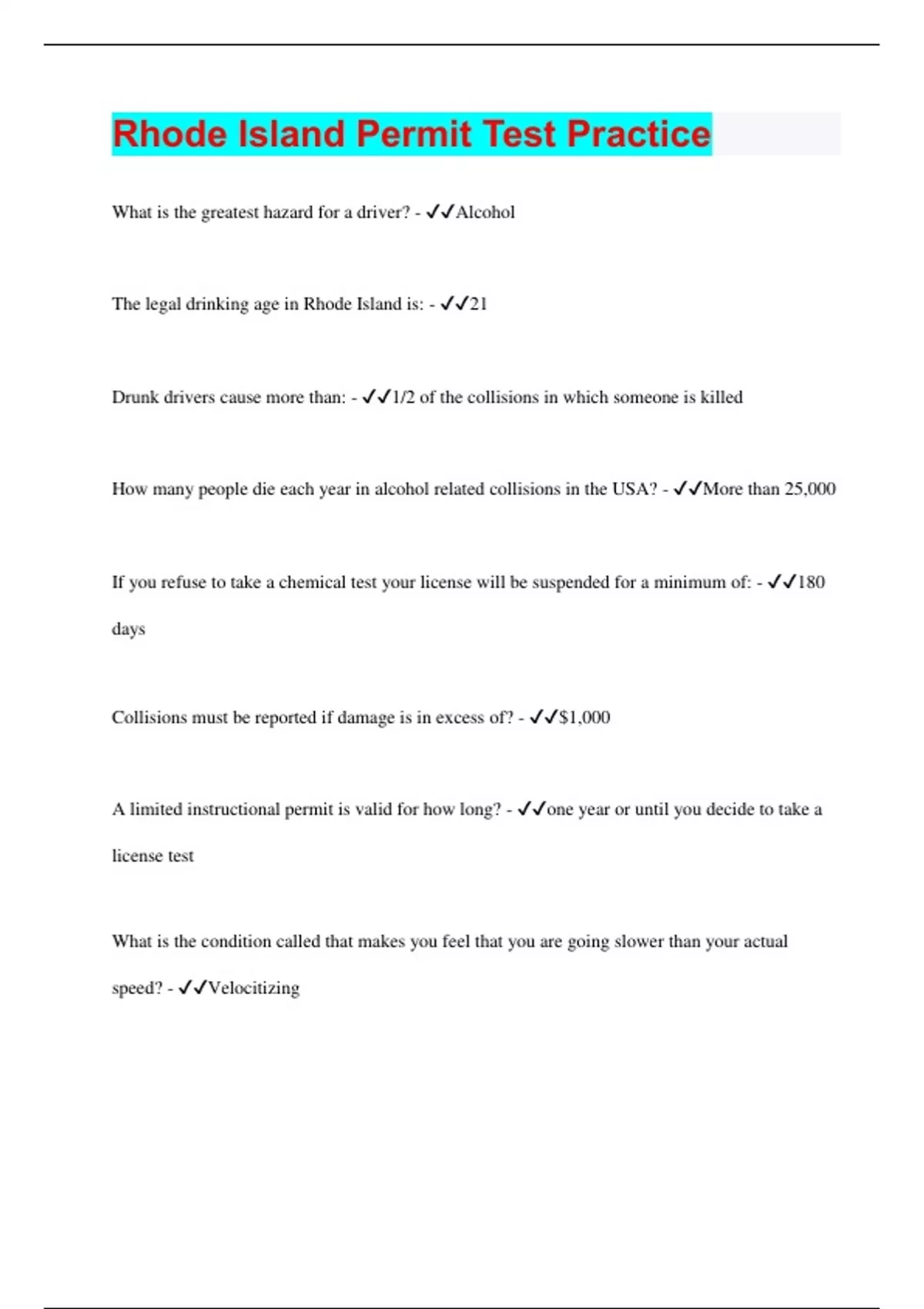 What is the greatest hazard for a driver? - Alcohol The legal drinking age in Rhode Island is: - 21 Drunk drivers cause more than: - 1/2 of the collisions in which someone is killed How many people die each year in alcohol related collisions in the USA? - More than 25,000 If you refuse to take a chemical test your license will be suspended for a minimum of: - 180 days Collisions must be reported if damage is in excess of? - $1,000 A limited instructional permit is valid for how long? - one year or until you decide to take a license test What is the condition called that makes you feel that you are going slower than your actual speed? - Velocitizing