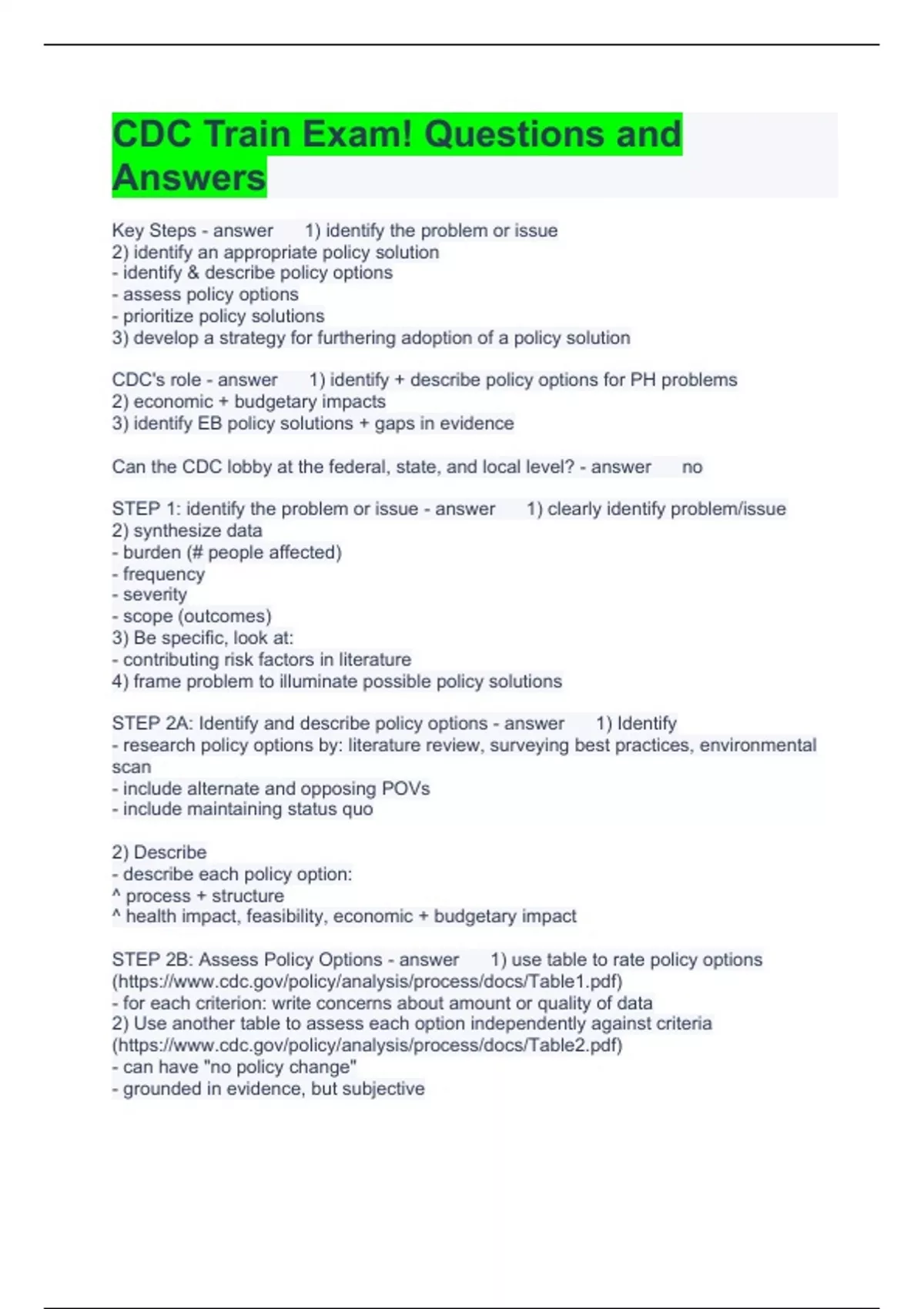 STEP 2B: Assess Policy Options - answer 1) use table to rate policy options (https://www.cdc.gov/policy/analysis/process/docs/Table1.pdf) - for each criterion: write concerns about amount or quality of data 2) Use another table to assess each option independently against criteria (https://www.cdc.gov/policy/analysis/process/docs/Table2.pdf)
