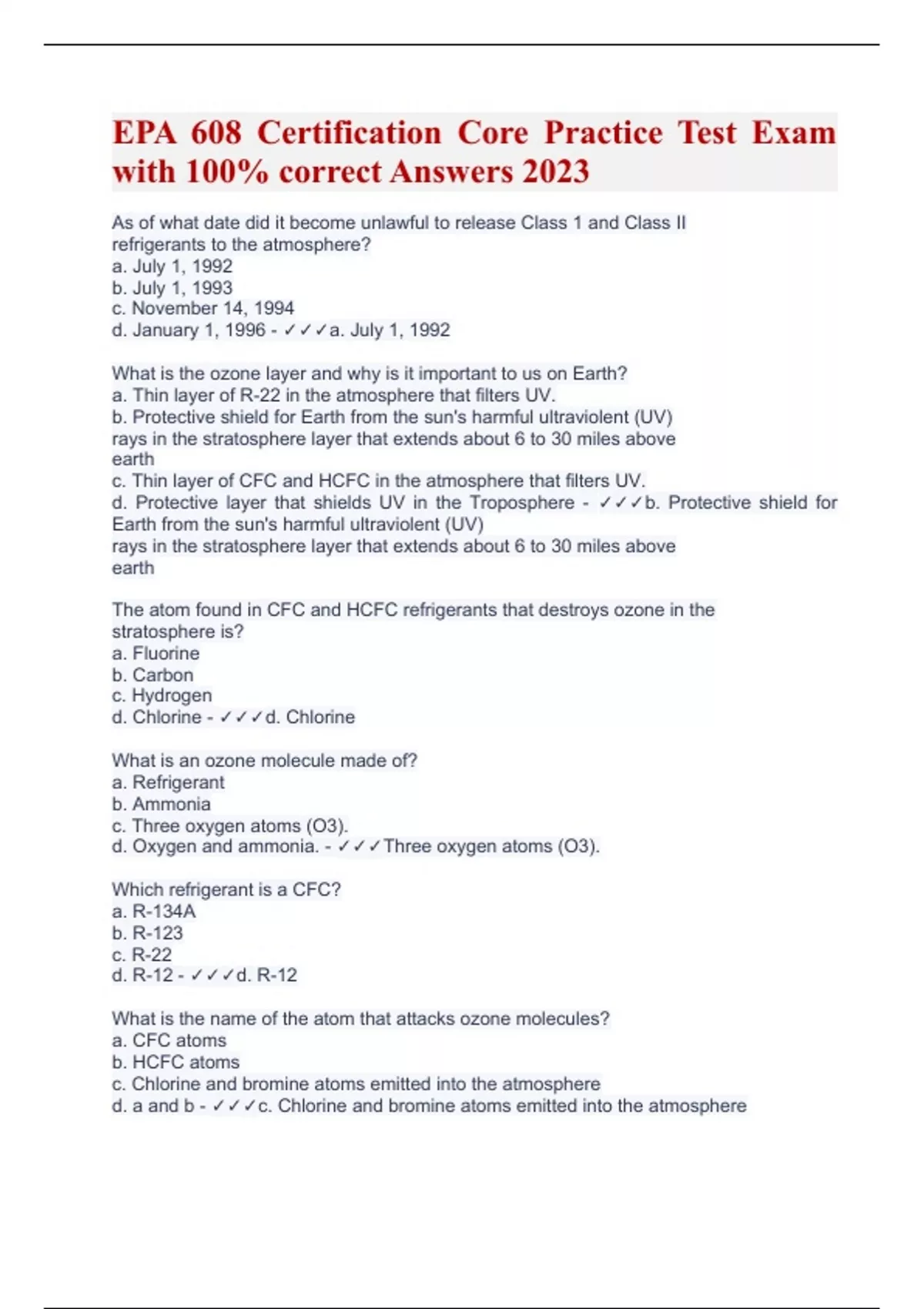 EPA 608 Certification Core Practice Test Exam with 100% correct Answers 2023