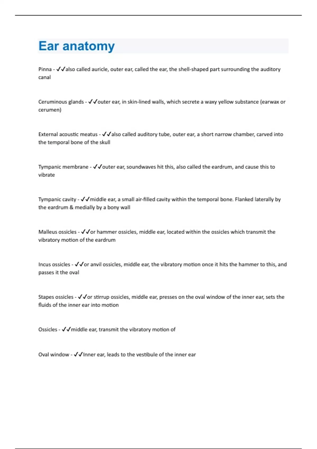 Pinna - also called auricle, outer ear, called the ear, the shell-shaped part surrounding the auditory canal Ceruminous glands - outer ear, in skin-lined walls, which secrete a waxy yellow substance (earwax or cerumen) External acoustic meatus - also called auditory tube, outer ear, a short narrow chamber, carved into the temporal bone of the skull Tympanic membrane - outer ear, soundwaves hit this, also called the eardrum, and cause this to vibrate Tympanic cavity - middle ear, a small air-filled cavity within the temporal bone. Flanked laterally by the eardrum & medially by a bony wall Malleus ossicles - or hammer ossicles, middle ear, located within the ossicles which transmit the vibratory motion of the eardrum Incus ossicles - or anvil ossicles, middle ear, the vibratory motion once it hits the hammer to this, and passes it the oval Stapes ossicles - or stirrup ossicles, middle ear, presses on the oval window of the inner ear, sets the fluids of the inner ear into motion Ossicles - middle ear, transmit the vibratory motion of Oval window - Inner ear, leads to the vestibule of the inner ear