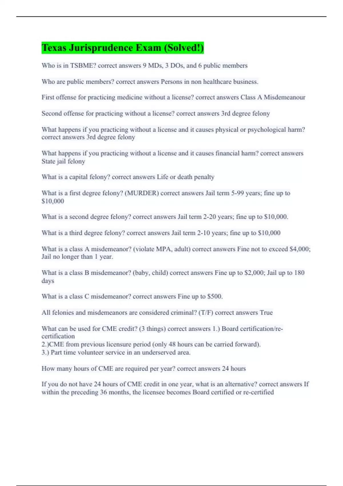 Who is in TSBME? correct answers 9 MDs, 3 DOs, and 6 public members Who are public members? correct answers Persons in non healthcare business. First offense for practicing medicine without a license? correct answers Class A Misdemeanour Second offense for practicing without a license? correct answers 3rd degree felony What happens if you practicing without a license and it causes physical or psychological harm? correct answers 3rd degree felony What happens if you practicing without a license and it causes financial harm? correct answers State jail felony What is a capital felony? correct answers Life or death penalty What is a first degree felony? (MURDER) correct answers Jail term 5-99 years; fine up to $10,000 What is a second degree felony? correct answers Jail term 2-20 years; fine up to $10,000. What is a third degree felony? correct answers Jail term 2-10 years; fine up to $10,000 What is a class A misdemeanor? (violate MPA, adult) correct answers Fine not to exceed $4,000; Jail no longer than 1 year. What is a class B misdemeanor? (baby, child) correct answers Fine up to $2,000; Jail up to 180 days What is a class C misdemeanor? correct answers Fine up to $500. All felonies and misdemeanors are considered criminal? (T/F) correct answers True What can be used for CME credit? (3 things) correct answers 1.) Board certification/re-certification 2.)CME from previous licensure period (only 48 hours can be carried forward). 3.) Part time volunteer service in an underserved area. How many hours of CME are required per year? correct answers 24 hours If you do not have 24 hours of CME credit in one year, what is an alternative? correct answers If within the preceding 36 months, the licensee becomes Board certified or re-certified