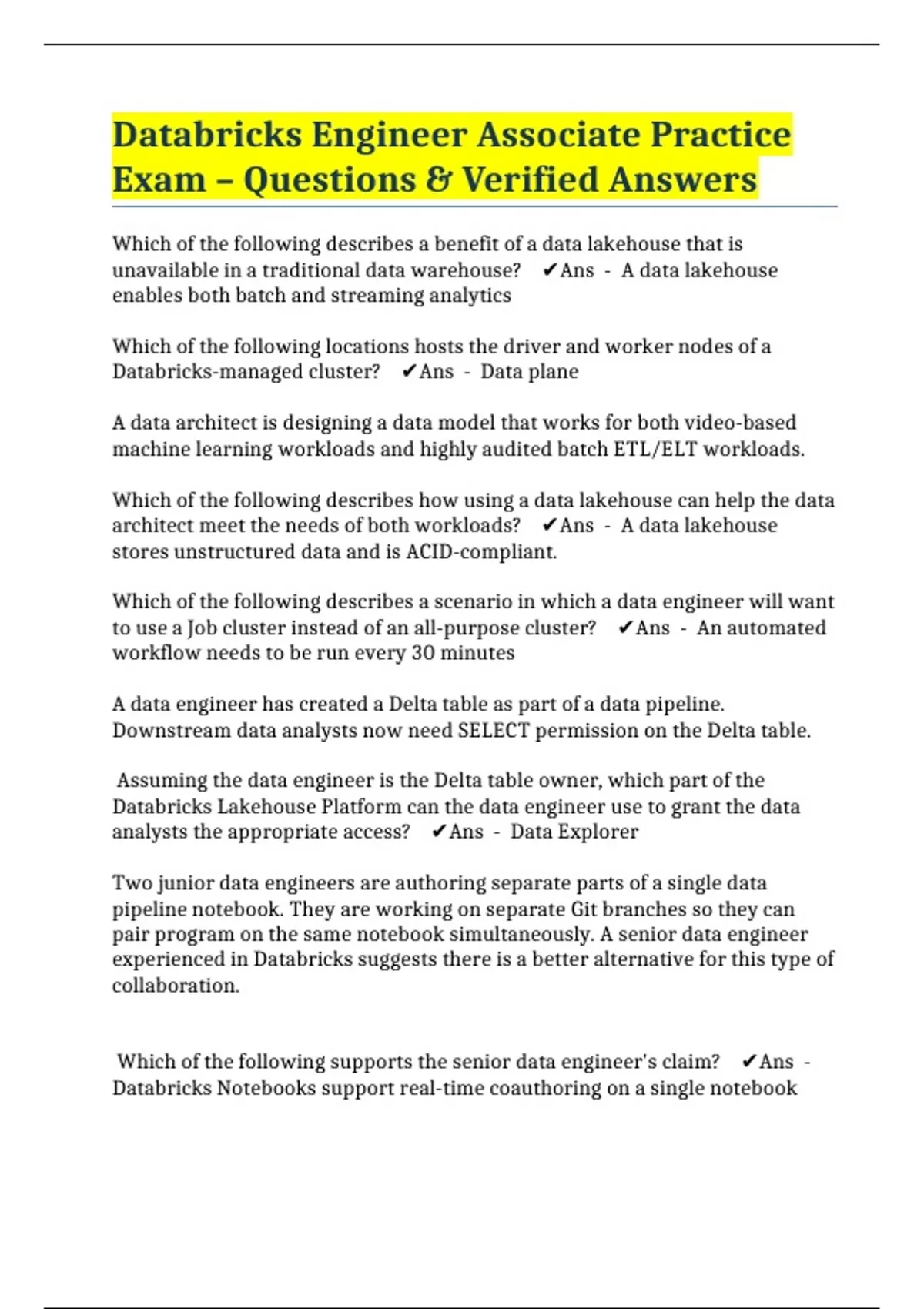Databricks Engineer Associate Practice Exam – Questions & Verified Answers