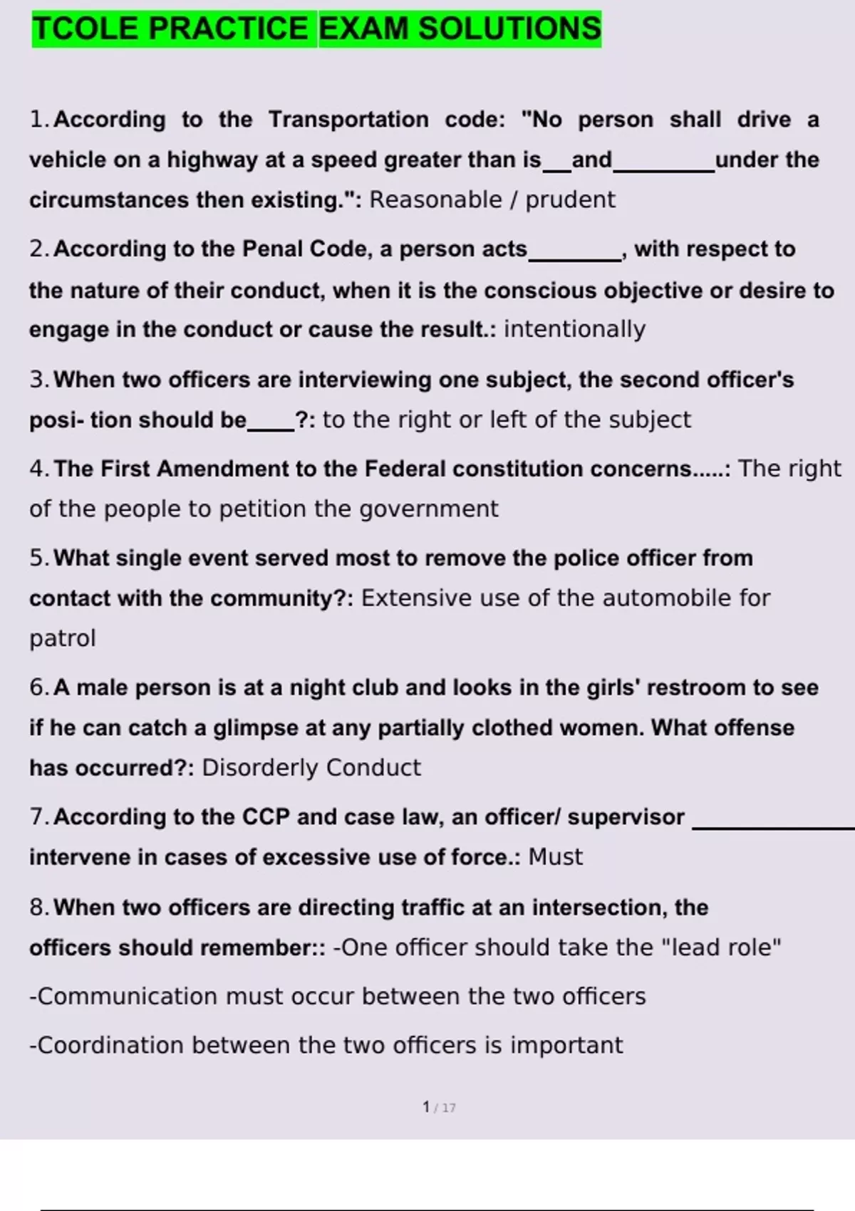 TCOLE PRACTICE EXAM SOLUTIONS QUESTIONS AND ANSWERS A+ GRADED