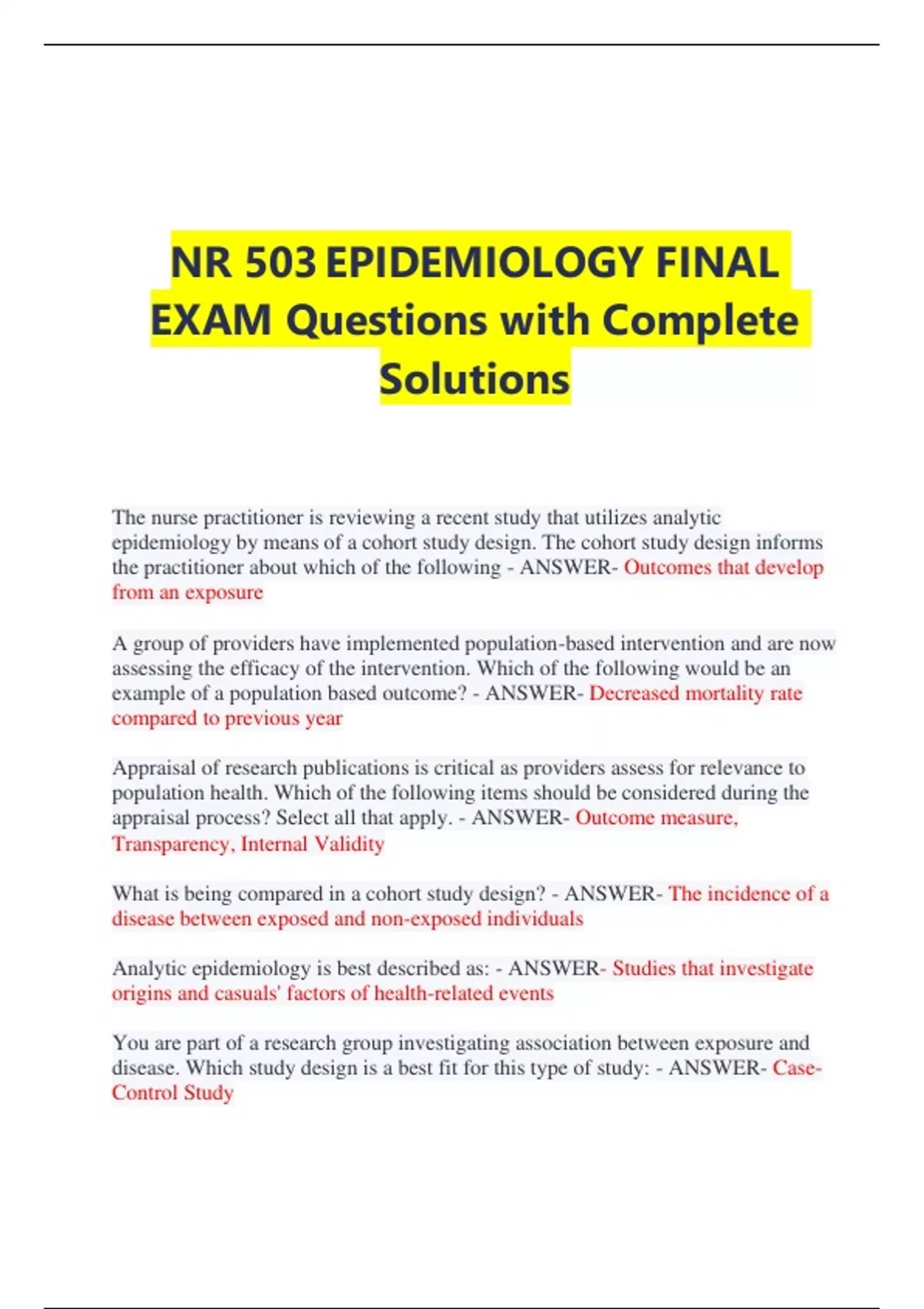 NR 503 EPIDEMIOLOGY FINAL EXAM Questions with Complete Solutions The nurse practitioner is reviewing a recent study that utilizes analytic epidemiology by means of a cohort study design. The cohort study design informs the practitioner about which of the following - ANSWER- Outcomes that develop from an exposure A group of providers have implemented population-based intervention and are now assessing the efficacy of the intervention. Which of the following would be an example of a population based outcome? - ANSWER- Decreased mortality rate compared to previous year Appraisal of research publications is critical as providers assess for relevance to population health. Which of the following items should be considered during the appraisal process? Select all that apply. - ANSWER- Outcome measure, Transparency, Internal Validity What is being compared in a cohort study design? - ANSWER- The incidence of a disease between exposed and non-exposed individuals Analytic epidemiology is best described as: - ANSWER- Studies that investigate origins and casuals' factors of health-related events You are part of a research group investigating association between exposure and disease. Which study design is a best fit for this type of study: - ANSWER- Case- Control Study The provider is concerned about what appears to be an increase in the mortality rate for their community. Mortality is an example of which of the following: - ANSWER- Vital statistic