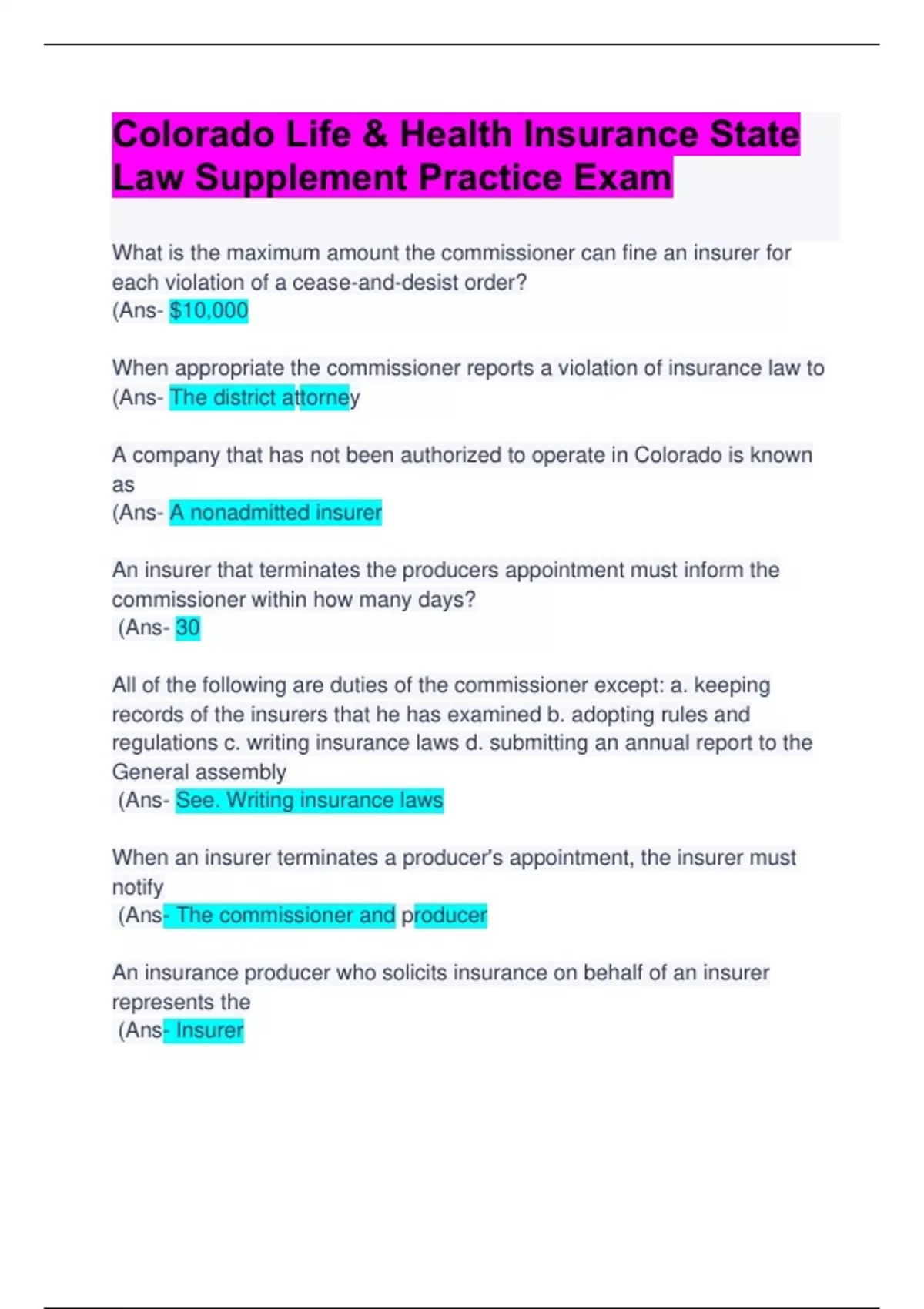 Colorado Life & Health Insurance State Law Supplement Practice Exam: Questions & Answers