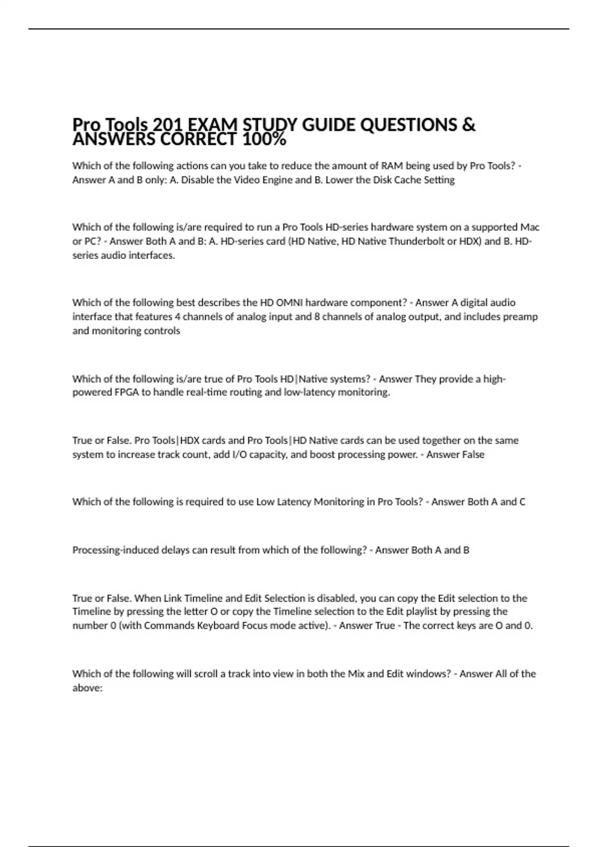 Which of the following actions can you take to reduce the amount of RAM being used by Pro Tools? - Answer A and B only: A. Disable the Video Engine and B. Lower the Disk Cache Setting Which of the following is/are required to run a Pro Tools HD-series hardware system on a supported Mac or PC? - Answer Both A and B: A. HD-series card (HD Native, HD Native Thunderbolt or HDX) and B. HD-series audio interfaces. Which of the following best describes the HD OMNI hardware component? - Answer A digital audio interface that features 4 channels of analog input and 8 channels of analog output, and includes preamp and monitoring controls Which of the following is/are true of Pro Tools HD|Native systems? - Answer They provide a high-powered FPGA to handle real-time routing and low-latency monitoring. True or False. Pro Tools|HDX cards and Pro Tools|HD Native cards can be used together on the same system to increase track count, add I/O capacity, and boost processing power. - Answer False Which of the following is required to use Low Latency Monitoring in Pro Tools? - Answer Both A and C Processing-induced delays can result from which of the following? - Answer Both A and B True or False. When Link Timeline and Edit Selection is disabled, you can copy the Edit selection to the Timeline by pressing the letter O or copy the Timeline selection to the Edit playlist by pressing the number 0 (with Commands Keyboard Focus mode active). - Answer True - The correct keys are O and 0. Which of the following will scroll a track into view in both the Mix and Edit windows? - Answer All of the above: Shift+Control-click (Mac) or Shift+Start-click (Windows) on the track nameplate in either window Shift+Control-click (Mac) or Shift+Start-click (Windows) on the track name in the Track List Right-click the track nameplate in either window and choose "Scroll Into View" Which of the following AutoMatch functions are available in Pro Tools? - Answer Both A and B To trim automation data in finer increments with the Trim Tool, which modifier key do you press? - Answer Command (Mac) or Ctrl (Windows) Which of the following best describes Trim automation mode? - Answer Writes automation to a separate Trim playlist, applying a relative change to existing automation What is the effect of pressing Option+[/] or Alt+[/] on the numberic keypad? - Answer Selects the Start field in the Transport window True or False. Workspace broswers include a Session focus that shows a consolidated view of all the files used in the currenct session, even if the files are not all located within the Audio Files folder on disk. - Answer True: When focused on an open session, the Workspace browser provides a single view for all the files referenced in the session, regardless of where the are stored, as well as powerful serach and management tools. How can you route a track to multiple outputs simulatnaeously (adding another output to the existing routing? - Answer Control-click (Mac) or Start-click (Windows) on the track's Output Path selector and select an additional output path. What modifer key can be used in addition to the +/- keys to nudge a clip's contents? - Answer Control (Mac) or Start (Windows) True or False. Using the Plug-In Setting menu, you can configure a plug-in to open with User Default settings you specify, rather than the Factory Default settings. - Answer True - Plug-ins can be configured with a User Default setting. True or False. The "Find all Candidates" option in the Relink window allows you to search for only a single missing file at a time. - Answer True How can you isolate a fader from group control in order to make an adjustment without affecting the entire group? - Answer Hold Control (Mac) or Start (Windows) while adjusting the fader
