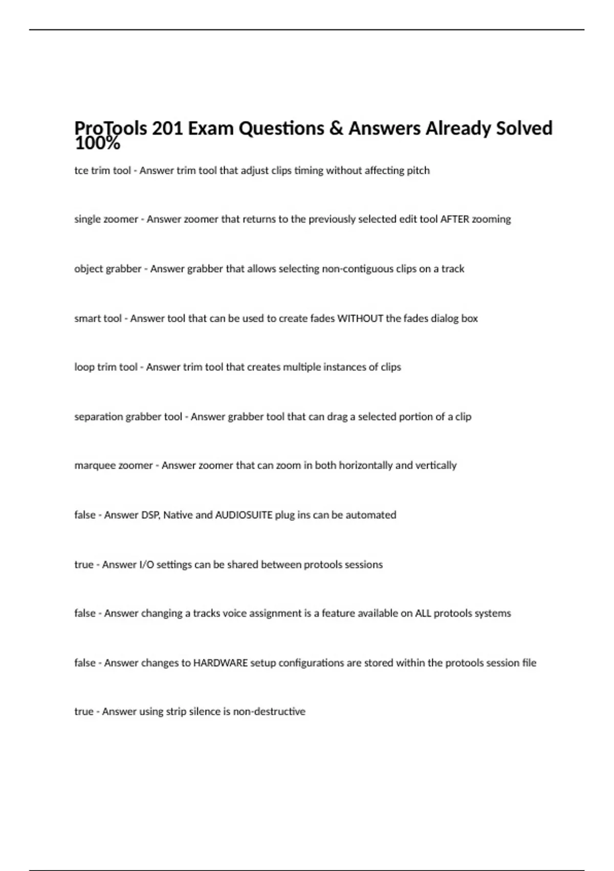 tce trim tool - Answer trim tool that adjust clips timing without affecting pitch single zoomer - Answer zoomer that returns to the previously selected edit tool AFTER zooming object grabber - Answer grabber that allows selecting non-contiguous clips on a track smart tool - Answer tool that can be used to create fades WITHOUT the fades dialog box loop trim tool - Answer trim tool that creates multiple instances of clips separation grabber tool - Answer grabber tool that can drag a selected portion of a clip marquee zoomer - Answer zoomer that can zoom in both horizontally and vertically false - Answer DSP, Native and AUDIOSUITE plug ins can be automated true - Answer I/O settings can be shared between protools sessions false - Answer changing a tracks voice assignment is a feature available on ALL protools systems false - Answer changes to HARDWARE setup configurations are stored within the protools session file true - Answer using strip silence is non-destructive false - Answer the amount of delay displayed on a tracks delay compensation view will be blue if it exceeds the maximum amount available true - Answer level meters on a VCA MASTER TRACK display the highest level of any member track true - Answer clip gain is applied to clips pre-mixer (before insert and plug-in processing) true - Answer delay compensation MUST be enabled in the options menu and value must be declared in the playback engine for delay compensation to be active false - Answer trim automation mode is one of the options in the "after write pass switch to..." preference false - Answer the "find links" button in the relink window only allows for relinking one file at a time MADI - Answer multi-channel-audio-digital interface FPGA - Answer field programmable gate array AFL/PFL - Answer after fader listen/pre fader listen