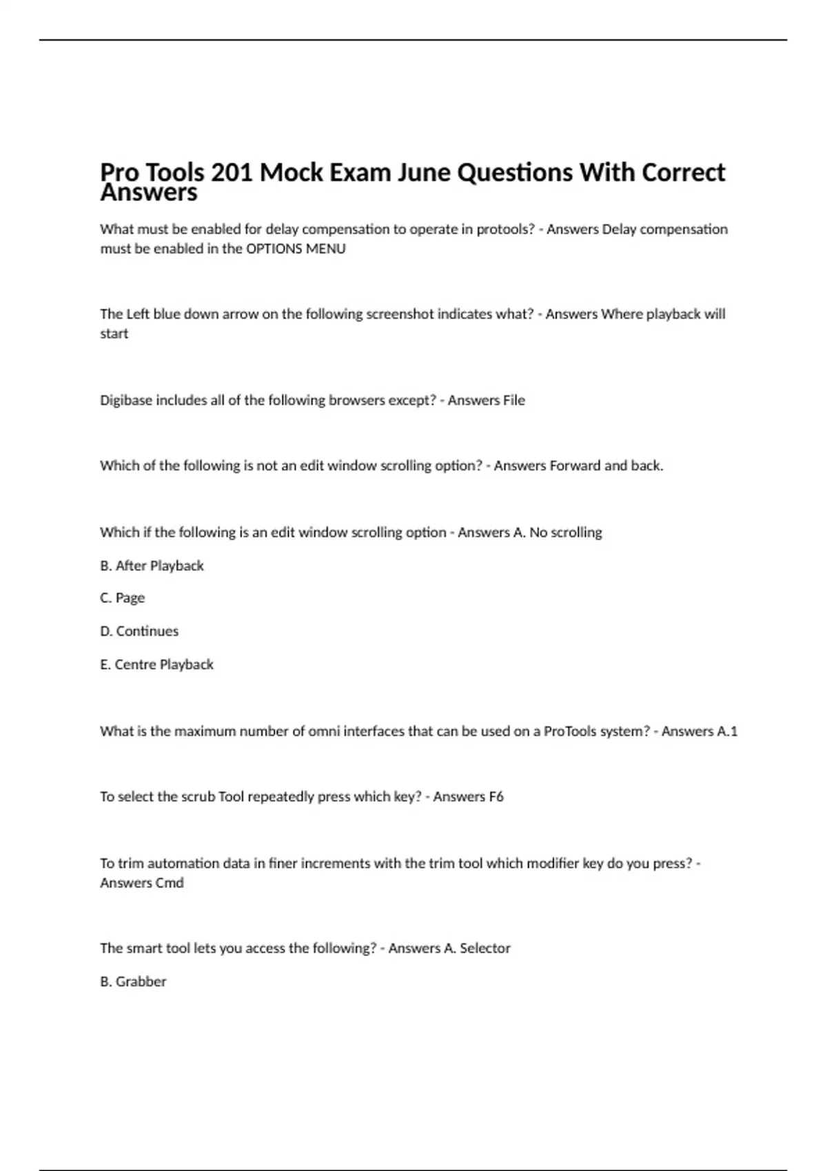 What must be enabled for delay compensation to operate in protools? - Answers Delay compensation must be enabled in the OPTIONS MENU The Left blue down arrow on the following screenshot indicates what? - Answers Where playback will start Digibase includes all of the following browsers except? - Answers File Which of the following is not an edit window scrolling option? - Answers Forward and back. Which if the following is an edit window scrolling option - Answers A. No scrolling B. After Playback C. Page D. Continues E. Centre Playback What is the maximum number of omni interfaces that can be used on a ProTools system? - Answers A.1 To select the scrub Tool repeatedly press which key? - Answers F6 To trim automation data in finer increments with the trim tool which modifier key do you press? - Answers Cmd The smart tool lets you access the following? - Answers A. Selector B. Grabber C.Trim D. Fade in, Fade out, Cross Fade Which of the following will deactivate a track? - Answers All of the above The workspace browser can be accessed from which menu? - Answers Window Which of the following are ways to suspend automation? - Answers w>automation or command+4 then click suspend. n+command-click: turn off/on all tracks. c. All of the above answer is all of the above. True or false :The find link option in the relinking window allows you to search for multiple files simultaneously - Answers True What modifier keys can be used along with the + and - keys to nudge the end time of a selection. - Answers Cmd+Shift(+or-) Which of the following are required to run ProTools HD. - Answers HD series card HD series audio interface With the smart tool active, placing the cursor in the lower half of a clip and not near a clip boundary will change the cursor to what? - Answers Grabber What modifier key can be used along with the + and - keys to nudge the start time of a selection. - Answers option+shift What modifier key can be used in addition to the + and - keys to trim a clips end point by the nudge value? - Answers Cmd What modifier key can be used in addition to the + and - to nudge a clips content? - Answers Ctrl The command for automation follows edit can be found under which menu? - Answers Option