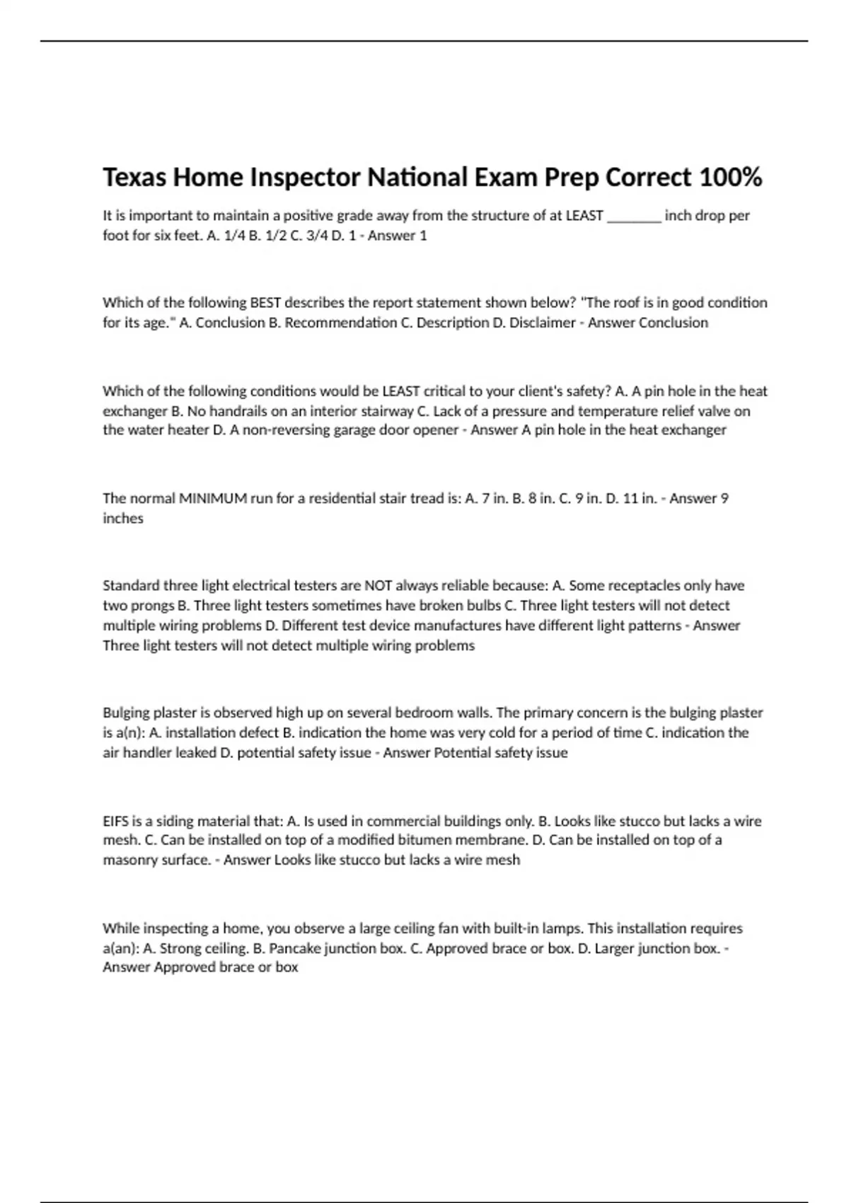 It is important to maintain a positive grade away from the structure of at LEAST _______ inch drop per foot for six feet. A. 1/4 B. 1/2 C. 3/4 D. 1 - Answer 1 Which of the following BEST describes the report statement shown below? "The roof is in good condition for its age." A. Conclusion B. Recommendation C. Description D. Disclaimer - Answer Conclusion Which of the following conditions would be LEAST critical to your client's safety? A. A pin hole in the heat exchanger B. No handrails on an interior stairway C. Lack of a pressure and temperature relief valve on the water heater D. A non-reversing garage door opener - Answer A pin hole in the heat exchanger The normal MINIMUM run for a residential stair tread is: A. 7 in. B. 8 in. C. 9 in. D. 11 in. - Answer 9 inches Standard three light electrical testers are NOT always reliable because: A. Some receptacles only have two prongs B. Three light testers sometimes have broken bulbs C. Three light testers will not detect multiple wiring problems D. Different test device manufactures have different light patterns - Answer Three light testers will not detect multiple wiring problems Bulging plaster is observed high up on several bedroom walls. The primary concern is the bulging plaster is a(n): A. installation defect B. indication the home was very cold for a period of time C. indication the air handler leaked D. potential safety issue - Answer Potential safety issue EIFS is a siding material that: A. Is used in commercial buildings only. B. Looks like stucco but lacks a wire mesh. C. Can be installed on top of a modified bitumen membrane. D. Can be installed on top of a masonry surface. - Answer Looks like stucco but lacks a wire mesh While inspecting a home, you observe a large ceiling fan with built-in lamps. This installation requires a(an): A. Strong ceiling. B. Pancake junction box. C. Approved brace or box. D. Larger junction box. - Answer Approved brace or box What are the types of heat that must be taken into account when calculating the cooling loads for an HVAC system? a. Sensible and radiant heat b. Radiant and conductive heat c. Conductive and latent heat d. Sensible and latent heat - Answer Sensible and latent heat Which of the following would be most likely to have the highest R-value? a. 6" fiberglass batt insulation b. 12" cast-in-place concrete wall c. 2" extruded polystyrene panel d. Triple insulated glazing system with ½" air spaces - Answer 6" fiberglass batt insulation An inspector can often determine the approximate age of a home by its method of construction. Which of the following choices shows the methods of construction in order from first developed to most recently developed? a. Post and beam construction, balloon framing, platform framing, ICF construction b. Balloon framing, post and beam construction, ICF construction, platform framing c. ICF construction, balloon framing, post and beam construction, platform framing d. Post and beam construction, platform framing, balloon framing, ICF construction - Answer Post and beam construction, balloon framing, platform framing, ICF construction One is inspecting an EIFS (Exterior Insulation and Finishing System) wall system for deficiencies. Where would these be most likely to occur? a. Window heads b. The center of large expanses of EIFS c. Along the bottom edge of the EIFS installation d. At the corners of the installation, such as around windows - Answer At the corners of the installation, such as around windows An inspector notes that the heat pump is not functioning and that the condensate pan under the air handler is full of water. Why might these two things be related? a. The full condensate pan tripped a condensate overflow switch. The unit turned off in order to ensure that condensate did not spill. b. The full condensate pan indicates that the fan in the air handler is not functioning, as it should. c. The full condensate pan indicates that there is a leak in the heat exchanger, which has depressurized the unit, causing it to turn off. d. The full condensate pan means that combustion byproducts have condensed and are flowing back into the house through the flue. This tripped the flue gas spill switch, turning the unit off. - Answer The full condensate pan tripped a condensate overflow switch. The unit turned off in order to ensure that condensate did not spill. While inspecting a crawl space, you should probe for decay if the _________ is dark in appearance. A. King joist B. Floor joist C. Masonry wall D. Bearing wall - Answer Floor joist What is the minimum allowed slope of graded soil next to a building's foundation, according to the International Residential Code (IRC)? a. ≥ 5"/10' b. ≥ 5"/12' c. ≥ 6"/12' d. ≥ 6"/10' - Answer ≥ 6"/10' Which of the following is not a solid fuel heating device? a. A fireplace b. A woodstove c. A coal furnace d. An electric heater - Answer An electric heater Every basement and sleeping room is required to have an easily operable emergency escape window. How large must this window be? a. At least 5.7 sq. ft b. At least 4.7 sq. ft c. At least 6.7 sq. ft d. At least 3.7 sq. ft - Answer At least 5.7 sq. ft The roofing material on a house or other building is considered a part of the roof drainage system. - Answer False The roofing material on a house or other building is not considered a part of the roof drainage system. - Answer True You are inspecting a residential property. You have to observe and/or test all of the readily accessible components of each system. Determine which of the following is not considered to be a readily accessible component of a room. a. A small window b. The doorknob on the closet door c. Nails or screws in the floor d. None of the above - Answer Nails or screws in the floor Branch circuits must be installed in several locations in every building. Which of the following is not one of them? a. Central HVAC equipment b. An office or bedroom c. The laundry room d. Bathrooms - Answer An office or 