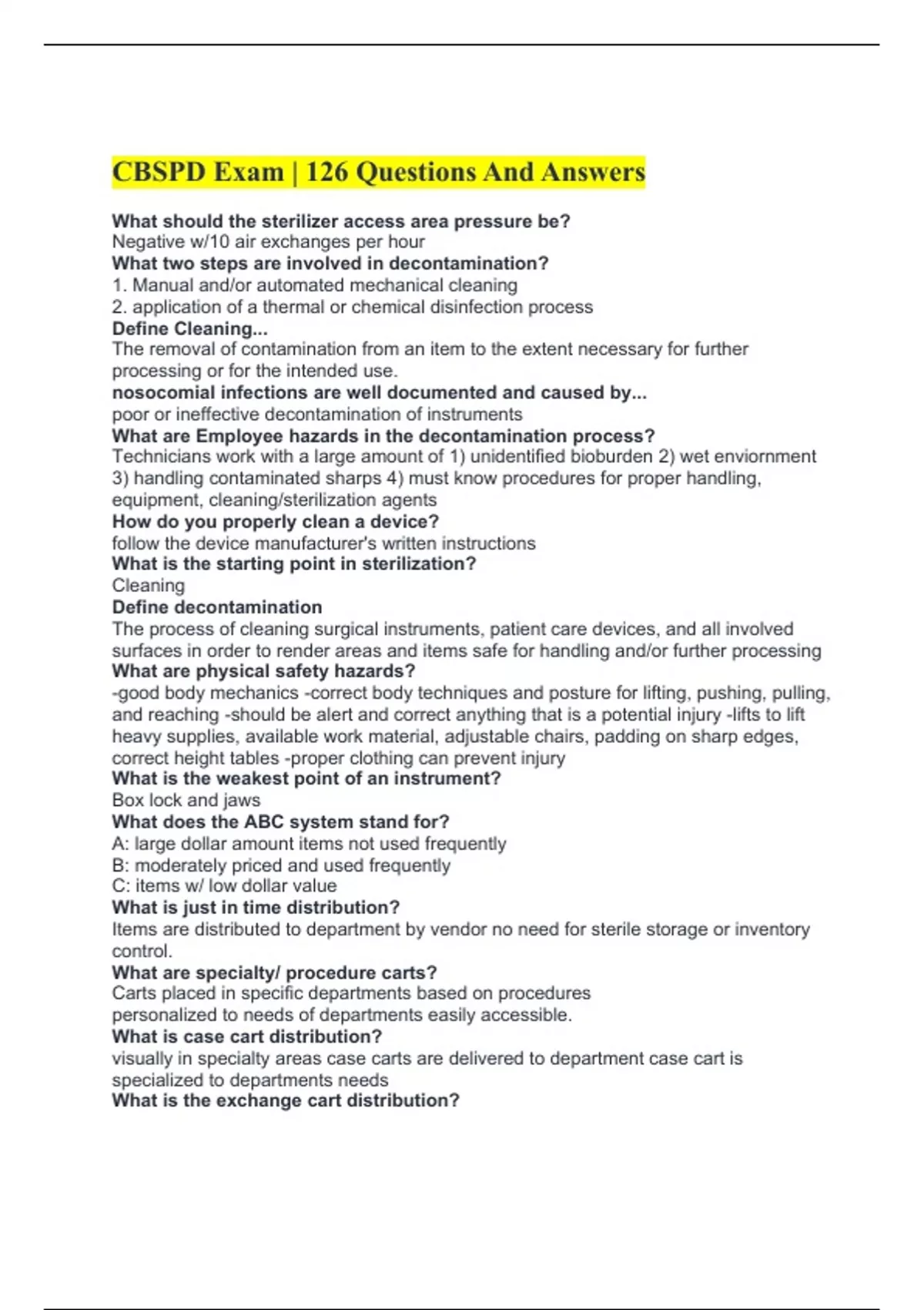 CBSPD Exam | 126 Questions And Answers What should the sterilizer access area pressure be? Negative w/10 air exchanges per hour What two steps are involved in decontamination? 1. Manual and/or automated mechanical cleaning 2. application of a thermal or chemical disinfection process Define Cleaning... The removal of contamination from an item to the extent necessary for further processing or for the intended use. nosocomial infections are well documented and caused by... poor or ineffective decontamination of instruments What are Employee hazards in the decontamination process? Technicians work with a large amount of 1) unidentified bioburden 2) wet enviornment 3) handling contaminated sharps 4) must know procedures for proper handling, equipment, cleaning/sterilization agents How do you properly clean a device? follow the device manufacturer's written instructions What is the starting point in sterilization? Cleaning Define decontamination The process of cleaning surgical instruments, patient care devices, and all involved surfaces in order to render areas and items safe for handling and/or further processing What are physical safety hazards? -good body mechanics -correct body techniques and posture for lifting, pushing, pulling, and reaching -should be alert and correct anything that is a potential injury -lifts to lift heavy supplies, available work material, adjustable chairs, padding on sharp edges, correct height tables -proper clothing can prevent injury What is the weakest point of an instrument? Box lock and jaws What does the ABC system stand for? A: large dollar amount items not used frequently B: moderately priced and used frequently C: items w/ low dollar value What is just in time distribution? Items are distributed to department by vendor no need for sterile storage or inventory control. What are specialty/ procedure carts? Carts placed in specific departments based on procedures personalized to needs of departments easily accessible. What is case cart distribution? visually in specialty areas case carts are delivered to department case cart is specialized to departments needs What is the exchange cart distribution? Two identical carts are made one is out in the department and other stays in SPD What is par level distribution? There is fixed inventory and when items become low they are replenished from the stockroom per department/specialty What is demand distribution? An instrument/cart must be ordered in o
