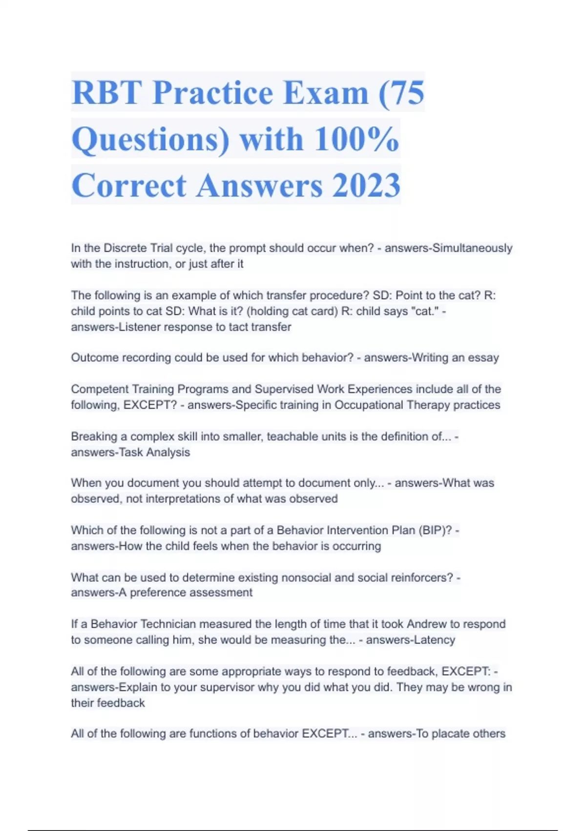 RBT Practice Exam (75 Questions) with 100% Correct Answers 2023 In the Discrete Trial cycle, the prompt should occur when? - answers-Simultaneously with the instruction, or just after it The following is an example of which transfer procedure? SD: Point to the cat? R: child points to cat SD: What is it? (holding cat card) R: child says "cat." - answers-Listener response to tact transfer