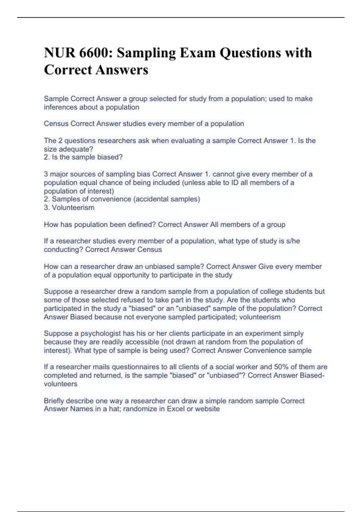 NUR 6600: Sampling Exam Questions with Correct Answers