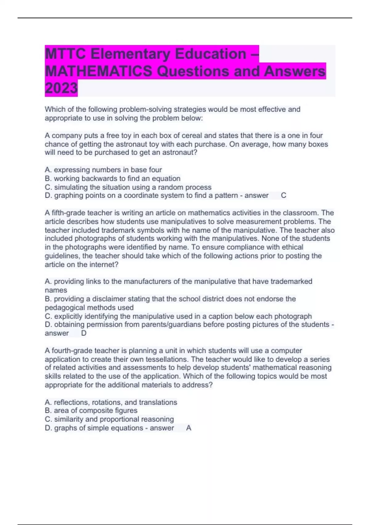 MTTC Elementary Education – MATHEMATICS Questions and Answers 2023 Which of the following problem-solving strategies would be most effective and appropriate to use in solving the problem below: A company puts a free toy in each box of cereal and states that there is a one in four chance of getting the astronaut toy with each purchase. On average, how many boxes will need to be purchased to get an astronaut? A. expressing numbers in base four B. working backwards to find an equation C. simulating the situation using a random process D. graphing points on a coordinate system to find a pattern C A fifth-grade teacher is writing an article on mathematics activities in the classroom. The article describes how students use manipulatives to solve measurement problems. The teacher included trademark symbols with he name of the manipulative. The teacher also included photographs of students working with the manipulatives. None of the students in the photographs were identified by name. To ensure compliance with ethical guidelines, the teacher should take which of the following actions prior to posting the article on the internet? A. providing links to the manufacturers of the manipulative that have trademarked names B. providing a disclaimer stating that the school district does not endorse the pedagogical methods used C. explicitly identifying the manipulative used in a caption below each photograph D. obtaining permission from parents/guardians before posting pictures of the students D A fourth-grade teacher is planning a unit in which students will use a computer application to create their own tessellations. The teacher would like to develop a series of related activities and assessments to help develop students' mathematical reasoning skills related to the use of the application. Which of the following topics would be most appropriate for the additional materials to address? A. reflections, rotations, and translations B. area of composite figures C. similarity and proportional reasoning D. graphs of simple equations A Using the distributive property can best be described as: A. an axiom B. a proof C. a postulate D. a definition B Integers are a subset of which of the following sets of numbers? A. negative numbers B. natural numbers C. rational numbers D. irrational numbers C Which of the following activities is most effective for creating a foundation for understanding the concept of multiplication? A. practicing basic addition facts with numbers 1 through 10 B. using base-ten blocks to model two-digit numbers C. modeling equality of numbers with a balance scale D. skip counting by different intervals on a number line D If the least common denominator is used to perform the operation a/6 + b/15, what will be the value of the numerator for the equivalent representation of a/6? A. 2a B. 5a C. 6a D. 15a B In which of the following pairs are the numbers equivalent? A. 106.0 x 10 ^ 4 and 1060.0 B. 8.63 x 10 ^ -5 and 0.00863 C. 5.72 x 10 ^ 5 and 572,000.0 D. 0.3374 x 10 ^ -4 and 0. C A person buys an item that costs $3.60 and pays for it with a $5.00 bill. The amount of change, in dollars, represents a number from which of the following sets? A. natural numbers B. rational numbers C. whole numbers D. nonnegative integers B According to the order of operations, what could be the first step in simplifying the expression below? 4/3 [(6^2 - 3^2) + 9 - 6] A. (8^2 - 4^2) + 12 - 8 B. 4/3 [(3^2) + 9 - 6] C. 4/3 [(6^2 - 3^2) - 3] D. 4/3 [(36 - 9) + 9 - 6] D An individual wants to purchase an air conditioner and can choose between two different options. Both options have an original price of $200. The first option offers 30% off the original price and charges $20 for shipping. The second option offers 15% off the original price and shipping is free. What is the difference in savings between the two options? A. $5 B. $10 C. $15 D. $20 B A teacher shows students how they can improve their computational fluency by providing them with frequent opportunities to use mental math to solve problems such as the ones below. 2 + 8 + 7 + 3 = ? 9 + 4 + 3 + 3 = ? 3 + 7 + 2 + 3 = ? Which of the following best describes the teacher's approach? A. finding sums by working left to right B. using a combination of addition and subtraction together C. finding number pairs that sum to easily recognizable numbers D. converting addition problems into multiplication problems C In solving the division problem 47 / 2.4, a student transforms the problem to 470 / 24. This operation is equivalent to which of the following? A. 47 / 2.4 x 10/10 B. (47 / 10 ) / 2.4 C. 2.4 / 47 x 10/10 D. (47 / 2.4) / 10 A Twenty-seven cubic centimeters is equivalent to how many liters? A. 0.03 liters B. 0.027 liters C. 0.003 liters D. 0.0027 liters B A table has a rectangular center portion and two semicircular ends that can be folded out to increase its size. When the ends are folded down, the rectangular portion has a length of 5 feet and an area of 30 square feet. Which of the following expressions represents the area of the table when the semicircular ends are folded out? A. 30 + 6pi square feet B. 30 + 9pi square feet C. 36pi square feet D. 39pi square feet B Students in a fifth-grade class draw a 1 unit by 1 unit square on a piece of paper, cut the square out, and use a scale to find its mass. The students then draw various irregular shapes on the same type of paper, cut them out, and find their masses, and compare them with the mass of the square. This activity is an example of using: A. indirect measurement to determine area B. direct measurement to determine area C. indirect measurement to determine perimeter D. direct measurement to determine perimeter A a curve in a plane surrounding two focal points such that the sum of the distances to the two focal points is constant for every point on the curve ellipse The use of a balance and two different shapes would be most appropriate in promoting students' skills in which of the following areas? A. equ