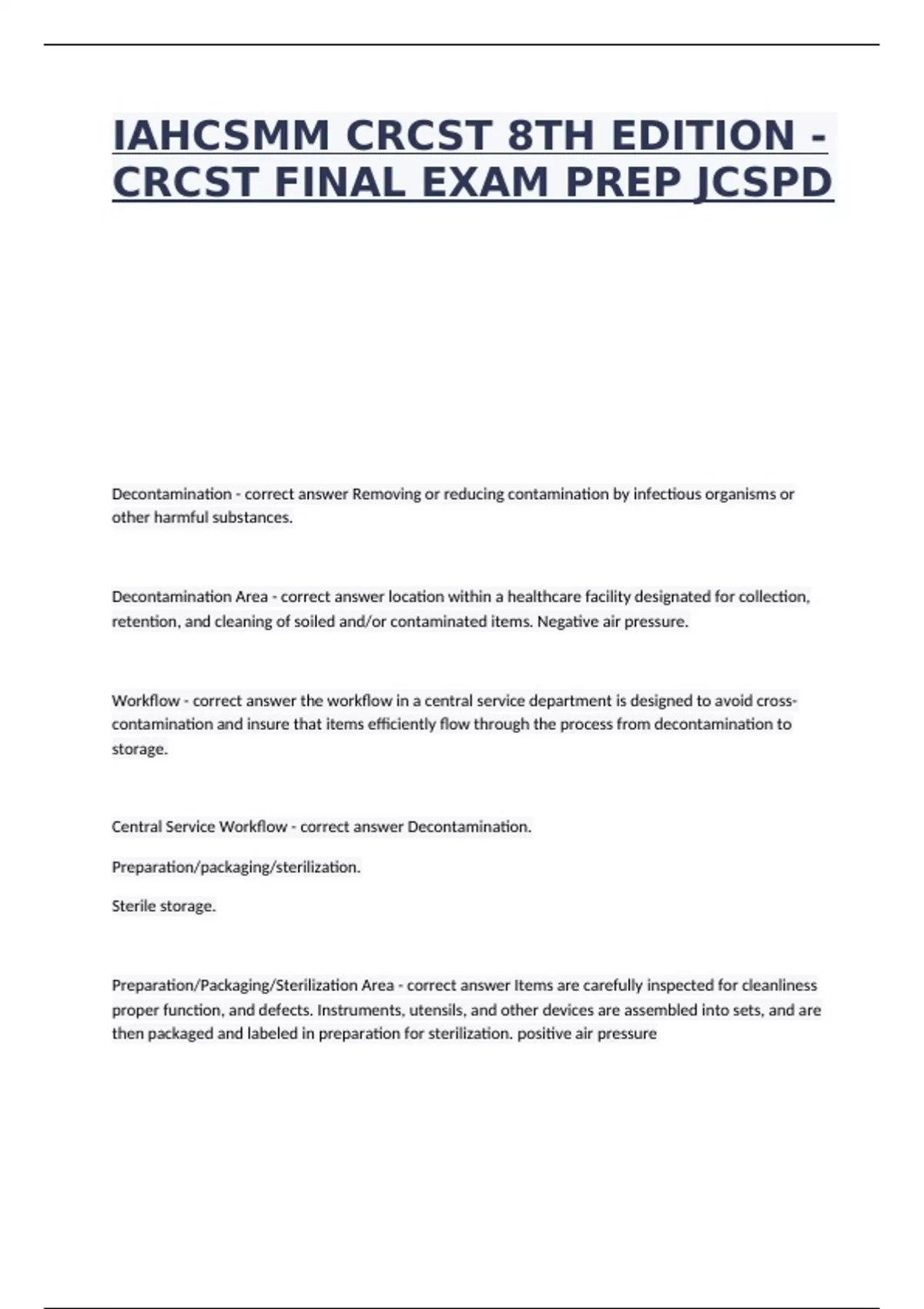 IAHCSMM CRCST 8TH EDITION - CRCST FINAL EXAM PREP JCSPD Decontamination - correct answer Removing or reducing contamination by infectious organisms or other harmful substances. Decontamination Area - correct answer location within a healthcare facility designated for collection, retention, and cleaning of soiled and/or contaminated items. Negative air pressure. Workflow - correct answer the workflow in a central service department is designed to avoid cross-contamination and insure that items efficiently flow through the process from decontamination to storage. Central Service Workflow - correct answer Decontamination. Preparation/packaging/sterilization. Sterile storage. Preparation/Packaging/Sterilization Area - correct answer Items are carefully inspected for cleanliness proper function, and defects. Instruments, utensils, and other devices are assembled into sets, and are then packaged and labeled in preparation for sterilization. positive air pressure Sterile Storage - correct answer The supply area of central service is dedicated to the storage of sterile and clean supplies. Positive air pressure. Case cart system - correct answer an inventory control system for products/equipment typically used in an operating room that involves use of an enclosed cart generally prepared for one surgical case. Case cart pull sheet / pick list - correct answer a list of specific supplies, utensils and instruments for a specific procedure. Central service technicians use these lists to assemble the items needed for individual surgical procedures. Negative air pressure - correct answer the situation that occurs when air flows into a room or area because the pressure in the area is less than that of surrounding areas. Positive air pressure - correct answer the situation that occurs when air flows out of a room or area because the pressure in the area is greater than that of surrounding areas. Processing cycle - correct answer Use. Return. Identify. clean. assemble. package. sterilize. store. Deliver. At each step in the process, items are inspected to ensure that they are clean, in good repair, assembled and processed correctly. Standard precautions - correct answer methods of using appropriate barriers to prevent transmissions of infectious organisms from contact with blood and all other body fluids, non-intact skin, and mucous membranes. applies to all patients, regardless of diagnosis or presumed infectious status. Nosocomial - correct answer hospital acquired infection Hemi- - correct answer half gastro - correct answer stomach -ectomy - correct answer surgical removal hemigastrectomy - correct answer removal of half of the stomach colo - correct answer colon hemicolectomy - correct answer removal of half of the colon -ac -al -ic -eal -ary -ous. are examples of. - correct answer pertaining to. endo- - correct answer within artery - correct answer artery -cide - correct answer kill -itis - correct answer inflammation -cise - correct answer cut -ectomy - correct answer surgical removal -oscopy - correct answer visual exam of an organ or joint -ostomy - correct answer creation of a new -otomy - correct answer incision into an organ laparoscopy - correct answer visual exam of organs in the abdomen colostomy - correct answer creation of new opening to the colon on the body -pexy - correct answer surgical fixation orchiopexy - correct answer surgically fixation of an undescended testicle to the correct location. -plasty - correct answer surgical restoration, plastic repair. rhinoplasty - correct answer surgical repair of the nose -rrhaphy - correct answer to suture -tome - correct answer a cutting instrument dermatome - correct answer an instrument used for cutting skin. artho - correct answer joint cardio - correct answer heart chole - correct answer bile cholecyst - correct answer gall bladder costo - correct answer rib intercosto - correct answer between the ribs gastro - correct answer stomach gyne - correct answer woman hema - correct answer blood hepat - correct answer liver