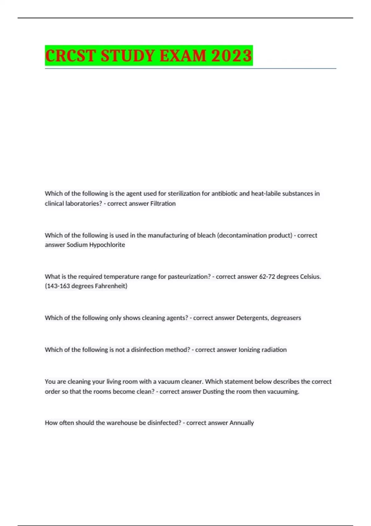 CRCST STUDY EXAM 2023 Which of the following is the agent used for sterilization for antibiotic and heat-labile substances in clinical laboratories? - correct answer Filtration Which of the following is used in the manufacturing of bleach (decontamination product) - correct answer Sodium Hypochlorite What is the required temperature range for pasteurization? - correct answer 62-72 degrees Celsius. (143-163 degrees Fahrenheit) Which of the following only shows cleaning agents? - correct answer Detergents, degreasers Which of the following is not a disinfection method? - correct answer Ionizing radiation You are cleaning your living room with a vacuum cleaner. Which statement below describes the correct order so that the rooms become clean? - correct answer Dusting the room then vacuuming. How often should the warehouse be disinfected? - correct answer Annually You are packing heavy and light instruments in a truck. Which ones should go in first? - correct answer The heavy items should be on the bottom while the light items should be on top. What is the preferred exchange range of air in the preparation and packaging room - correct answer 10 % What is the best temperature for flowers in the preparation and packing room? - correct answer 33-37 degrees Fahrenheit What is the oldest packaging material in the world? - correct answer Glass What type of pressure is used to package food and beverage products? - correct answer High pressure Which of the following shows the processes of sterilization? - correct answer Chemicals, irradiation, heat Which of the following options is used to mechanically sterilize medical equipment? - correct answer Ultrasonic waves Microorganisms are destroyed using a steam reaction known as? - correct answer First order Which of the following processes only shows sterilization methods? - correct answer Heat, radiation, chemical agents I want to use batch sterilization for medical tools. What is the best temperature and then state a reason for your answer? - correct answer 121°C Sterilization deactivates different spores of organisms. Which one is referred to as control? - correct answer Exospores Which item of clinical equipment can you use to stop a person's bleeding? - correct answer Penlight A patient is brought to a hospital with a high fever. Which tool will you use to measure their temperature? - correct answer Clinical thermometer Tom just told the doctor he is having difficulty reading from the blackboard. Which tool will the doctor first use to examine Tom's pupil dilation? - correct answer Penlight Which statement describes the minimum required SPD sterile storage conditions? - correct answer A controlled humidity of 30%-60% and a temperature of 18°C-23°C (64°C-74°C) is the minimum required temperature range. For option D, traffic needs to be limited. For option A, high humidity is not required and for option C, high temperature is not required. What is the substance inside the ABC extinguisher? - correct answer Ammonium phosphate In inventory management, where are delivery and requisitions recorded? - correct answer Demand Which statement best describes the correct order of naming a file for easy accessibility by all parties? - correct answer Department, date, serial number Which of documentation is not useful to a company's staff? - correct answer Products' how-to guides A customer calls the tax office about the deadline for the tax waiver and account number for a specific region. While on the call, you do not know what the correct answer is. What is the fastest way to help the client? - correct answer Ask the customer for their email address or a phone number that you can relay the details to. A person comes into the office shouting about being overcharged for their subscriptions. What is the best way to handle the issue as you are registering a new client? - correct answer Ask for their receipt and confirm their claim. A person just called your department erroneously and wants to get help from you. What should you do? - correct answer Transfer them to the correct department.